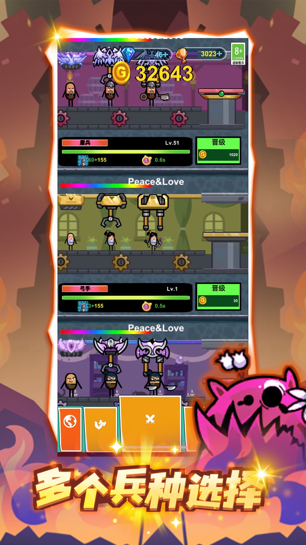 「」多重士兵角色:盾兵、弓兵、刺客、法师。