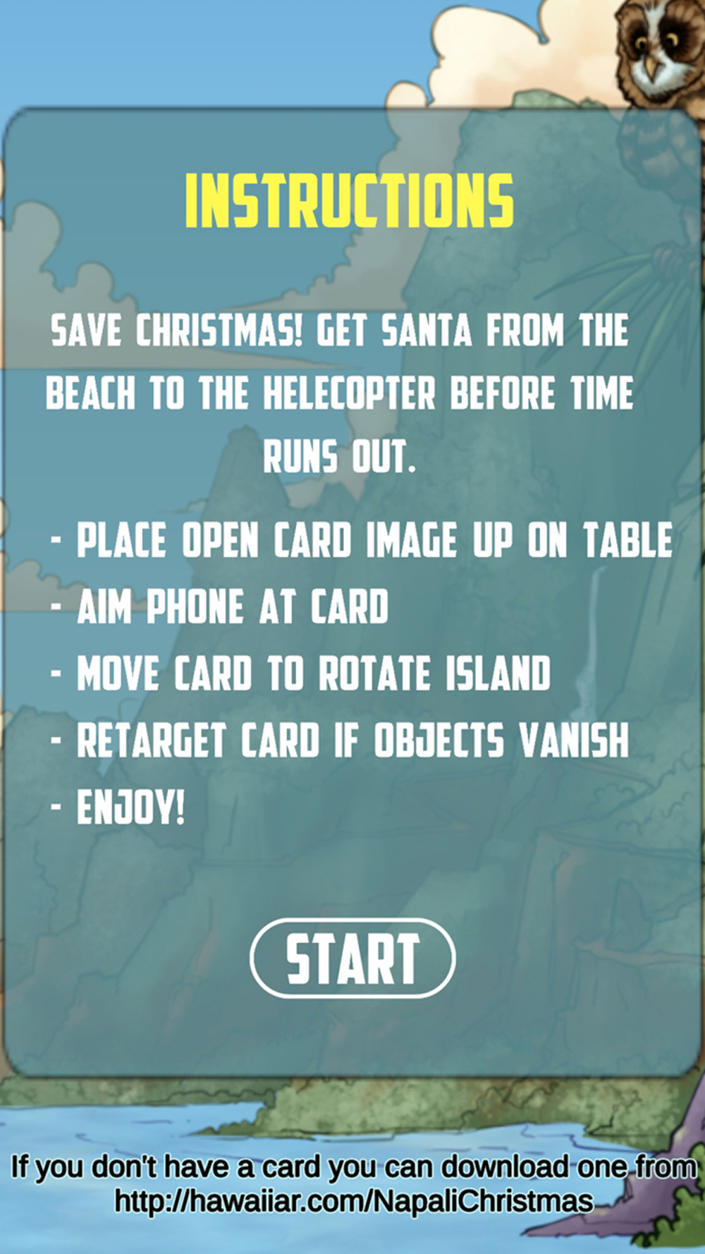 Help Santa get from the beach to the Helicopter and Save Christmas in a silly augmented reality island race. Look out for rocks, don't fall off the mountain and have fun. In order for the app to work you must have a paper copy of HawaiiAR's latest Christmas card.