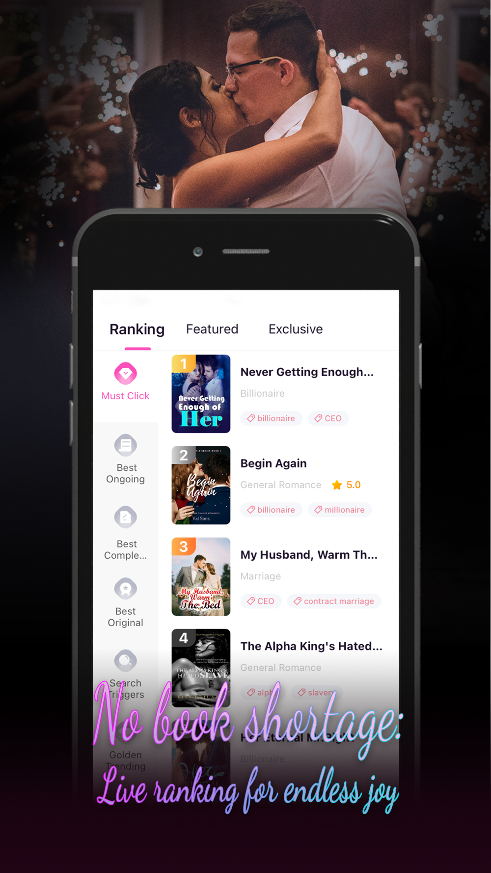 You can find trending novels, exclusive novel, and any types you love here. Our tags include CEO, Billionaire, Werewolf, Vampire, Romance, Modern, Teenfiction, Fantasy, Suspense, Thriller, History, and more!