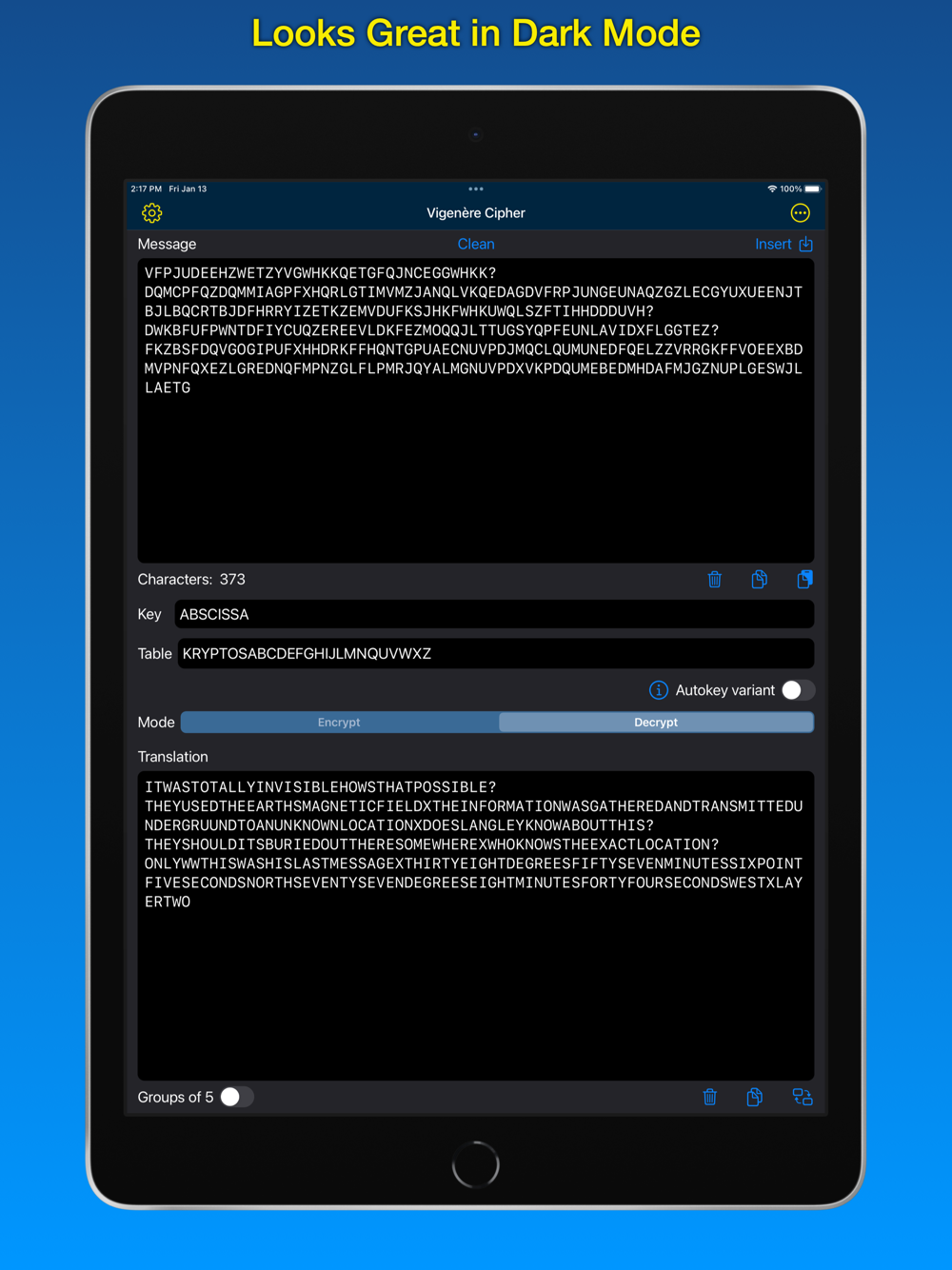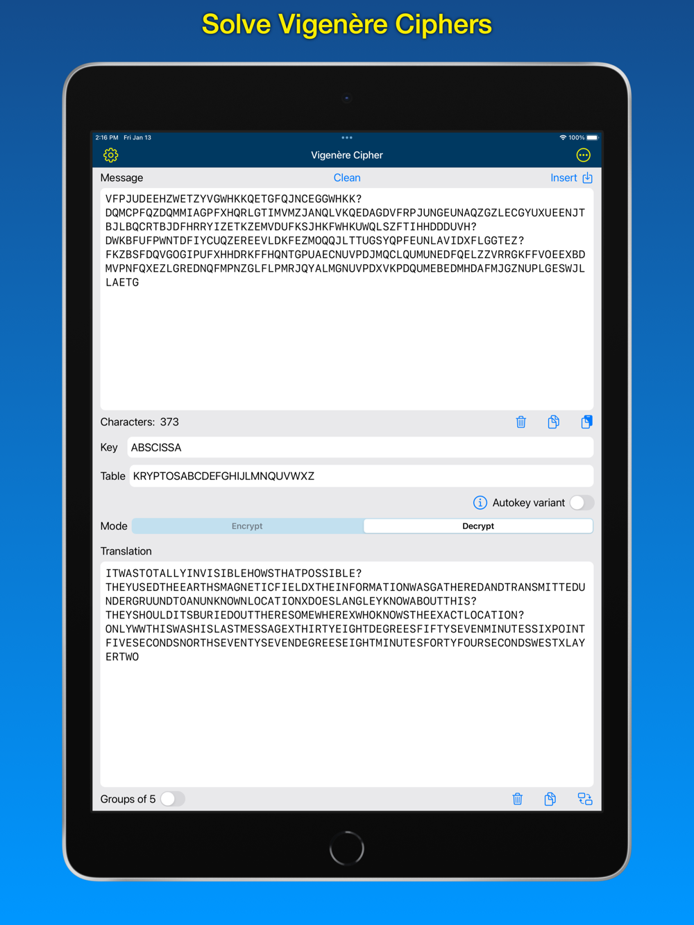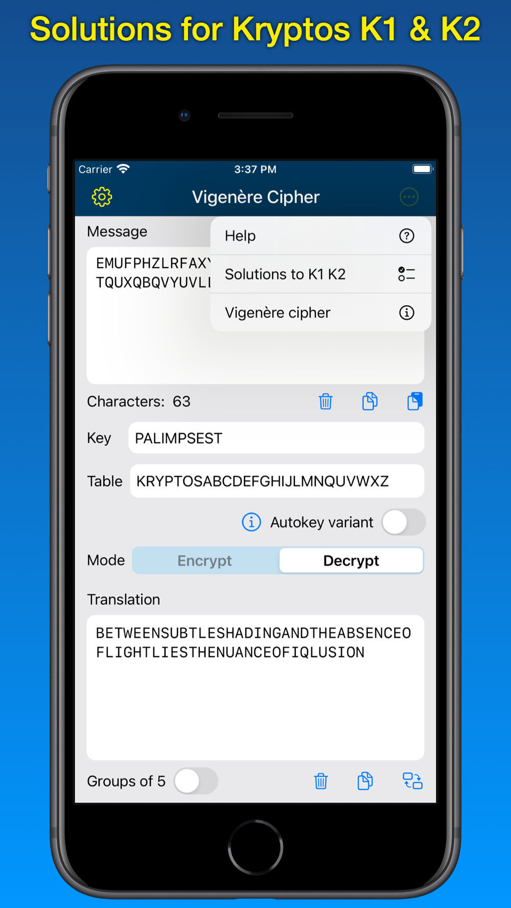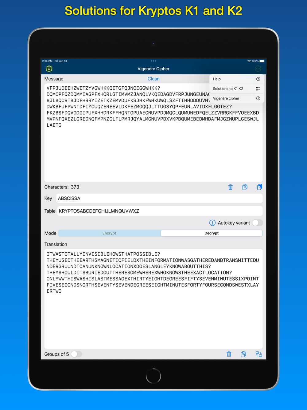 Kryptos Tools - Vigenère Cipher provides an easy interface to learn and use the Vigenère cipher. The Vigenère cipher was used to encrypt the first two sections of the Kryptos sculpture and solutions to these sections are detailed within the app.