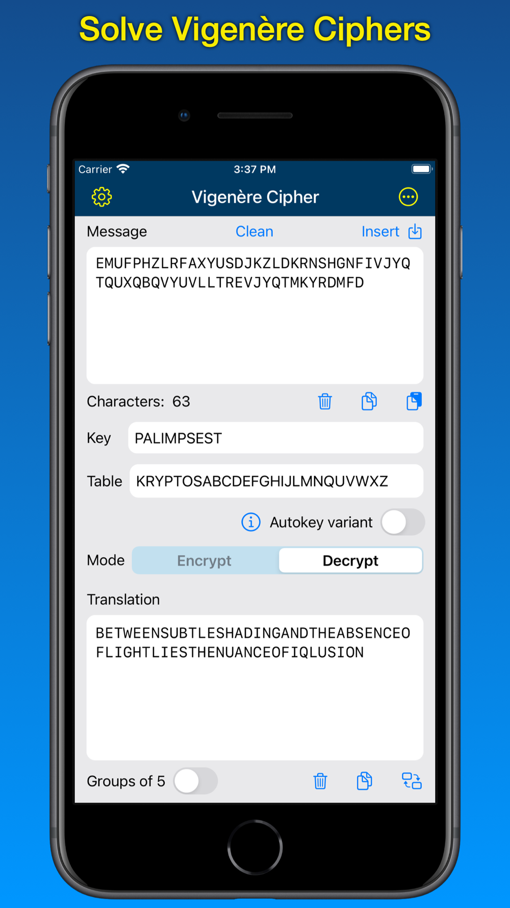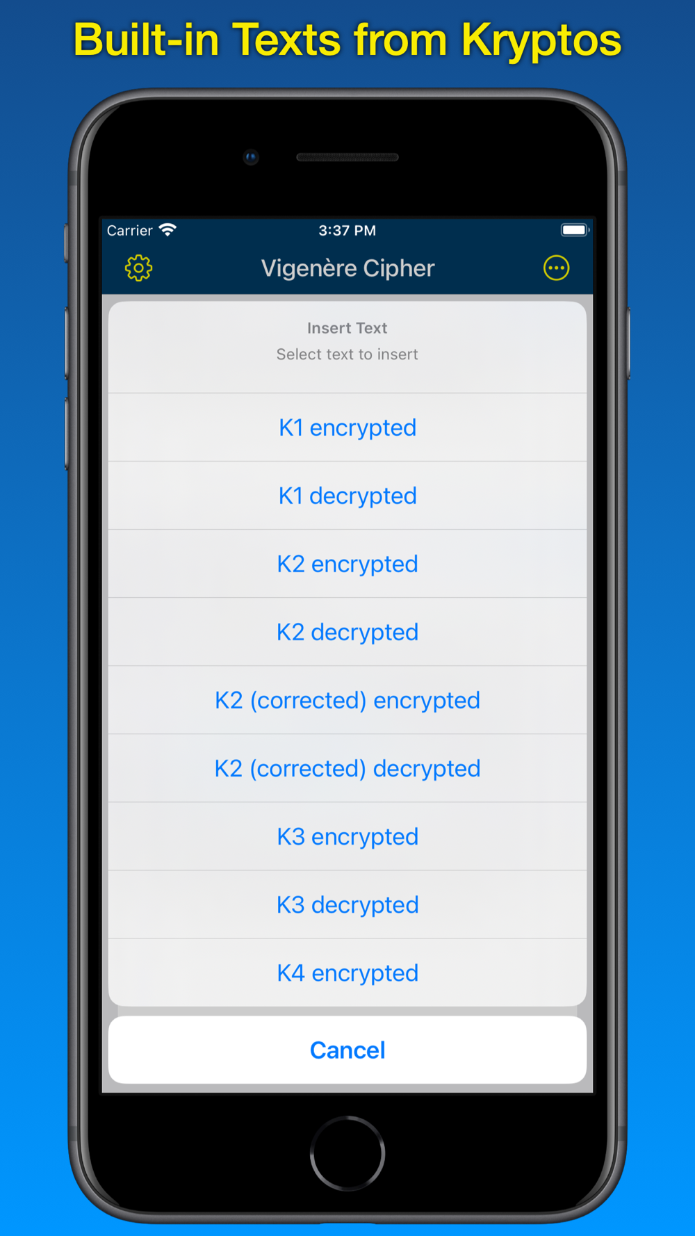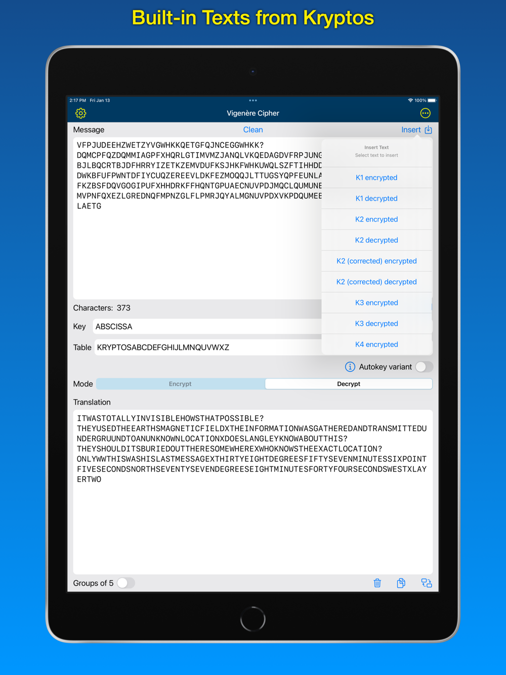 Kryptos Tools - Vigenère Cipher provides an easy interface to learn and use the Vigenère cipher. The Vigenère cipher was used to encrypt the first two sections of the Kryptos sculpture and solutions to these sections are detailed within the app.