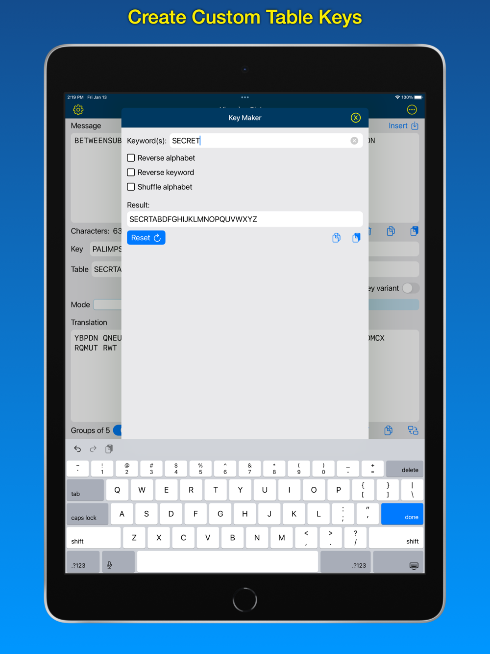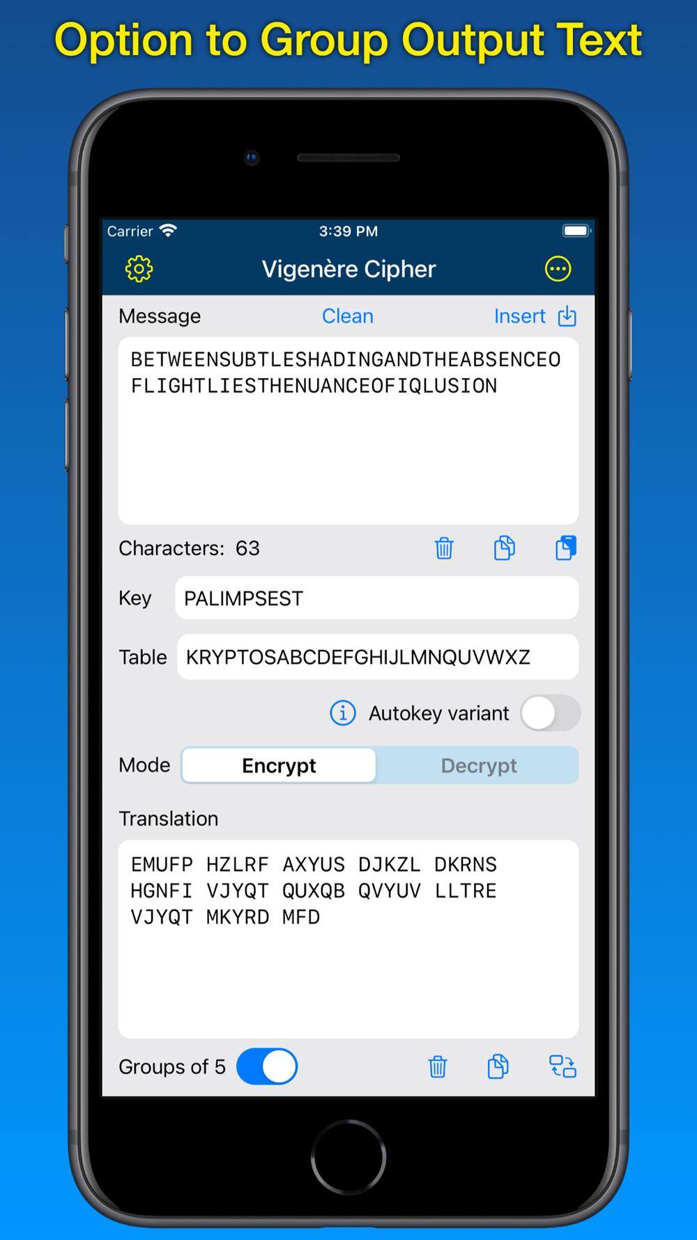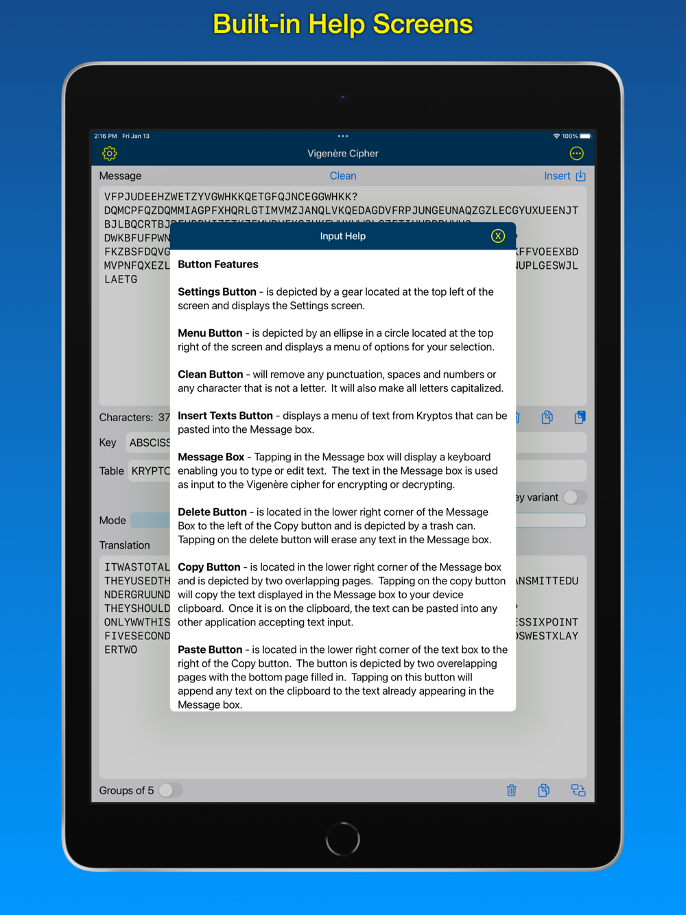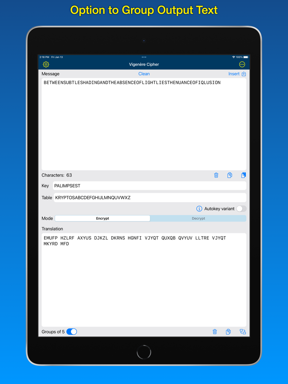 Kryptos Tools - Vigenère Cipher provides an easy interface to learn and use the Vigenère cipher. The Vigenère cipher was used to encrypt the first two sections of the Kryptos sculpture and solutions to these sections are detailed within the app.