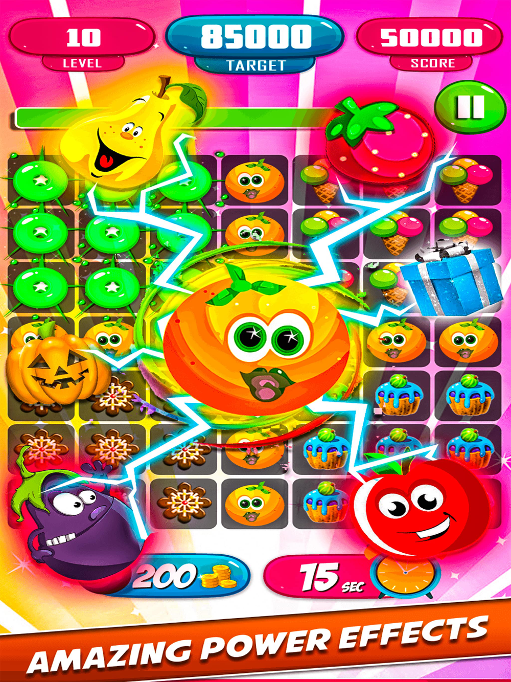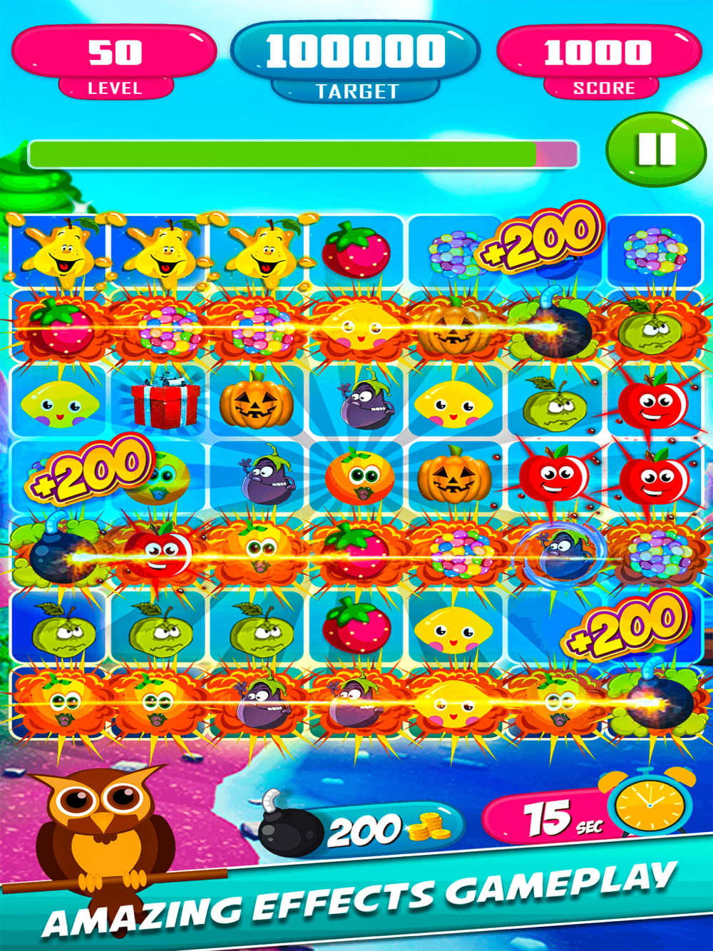 To go on the journey of exploring fruits candy forest world need your help! Unwrap & Collect fruit candies for them. Use booster and magic tools to blast! Blast more than 3 fruit candies will create powerful booster, use them to fruit blast all the challenging obstacles and reach your goal.