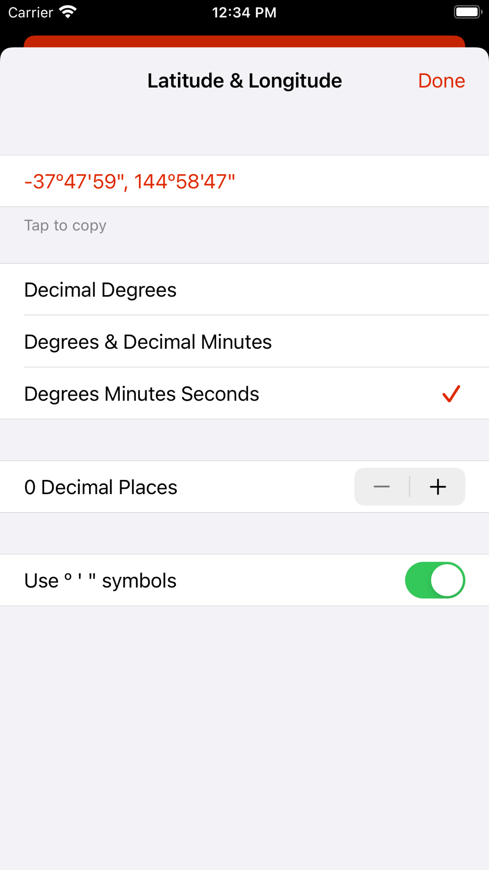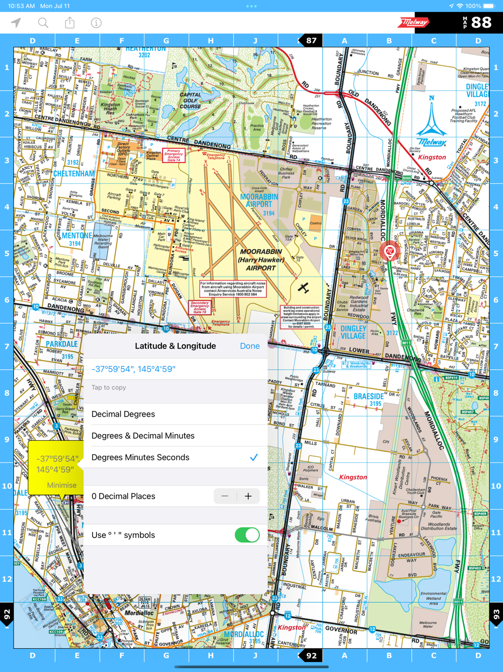 • Tap latitude and longitude in the position marker to customise the format or copy