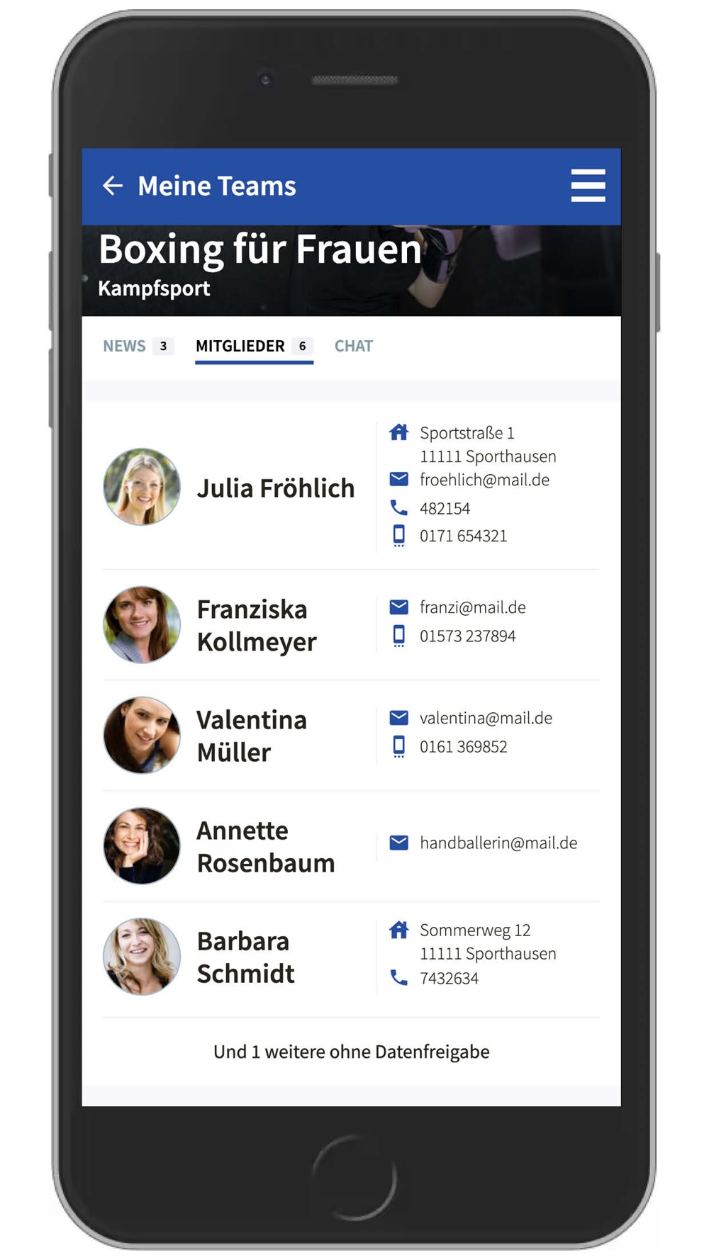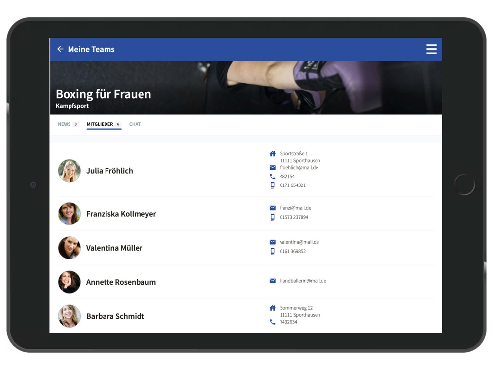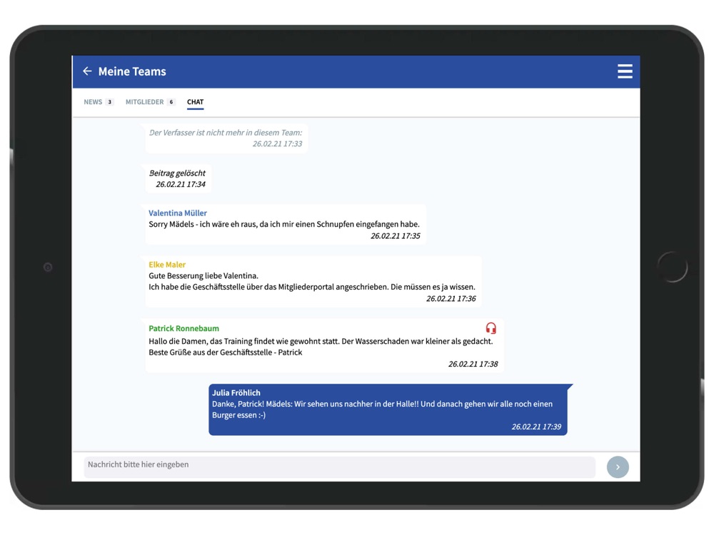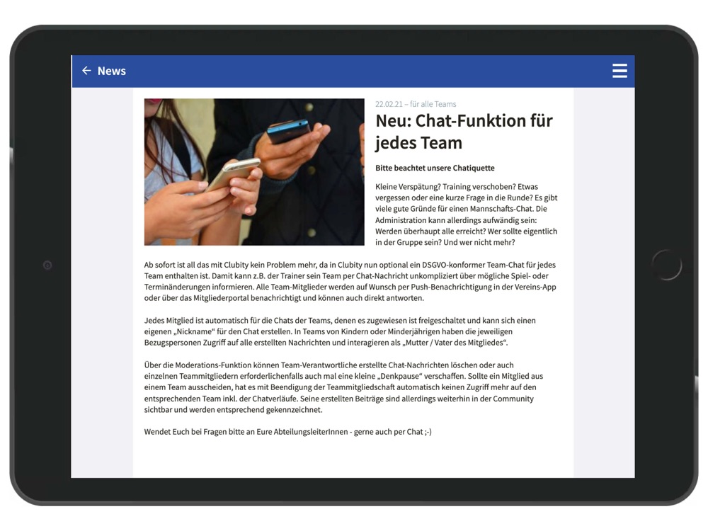 - Team-Bereich: Schau Dir Team-bezogene News an, stöbere in Team-Fotoalben oder nutze Kommunikationsmöglichkeiten mit anderen Mitgliedern, wenn diese dies freigegeben haben.