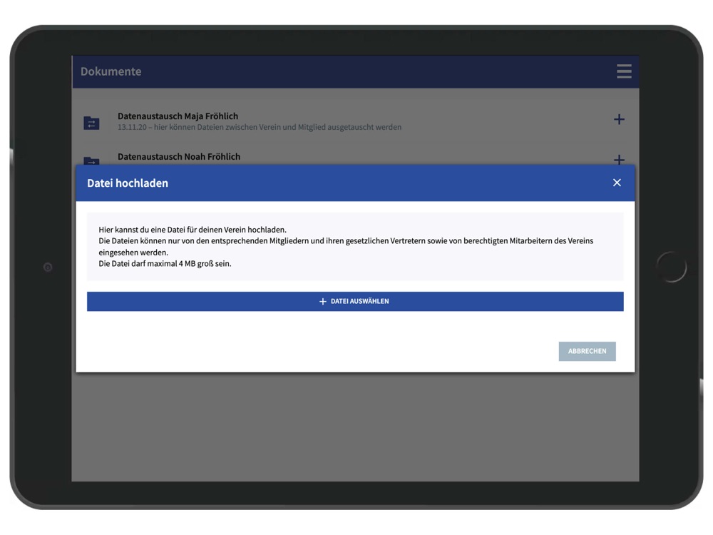 - Upload von Dokumenten: Lade wichtige Dokumente, wie Ermäßigungsbescheide, Bescheinigungen oder andere Dokumente datenschutzkonform und sicher einfach über die App zu Deiner Mitgliederverwaltung hoch.