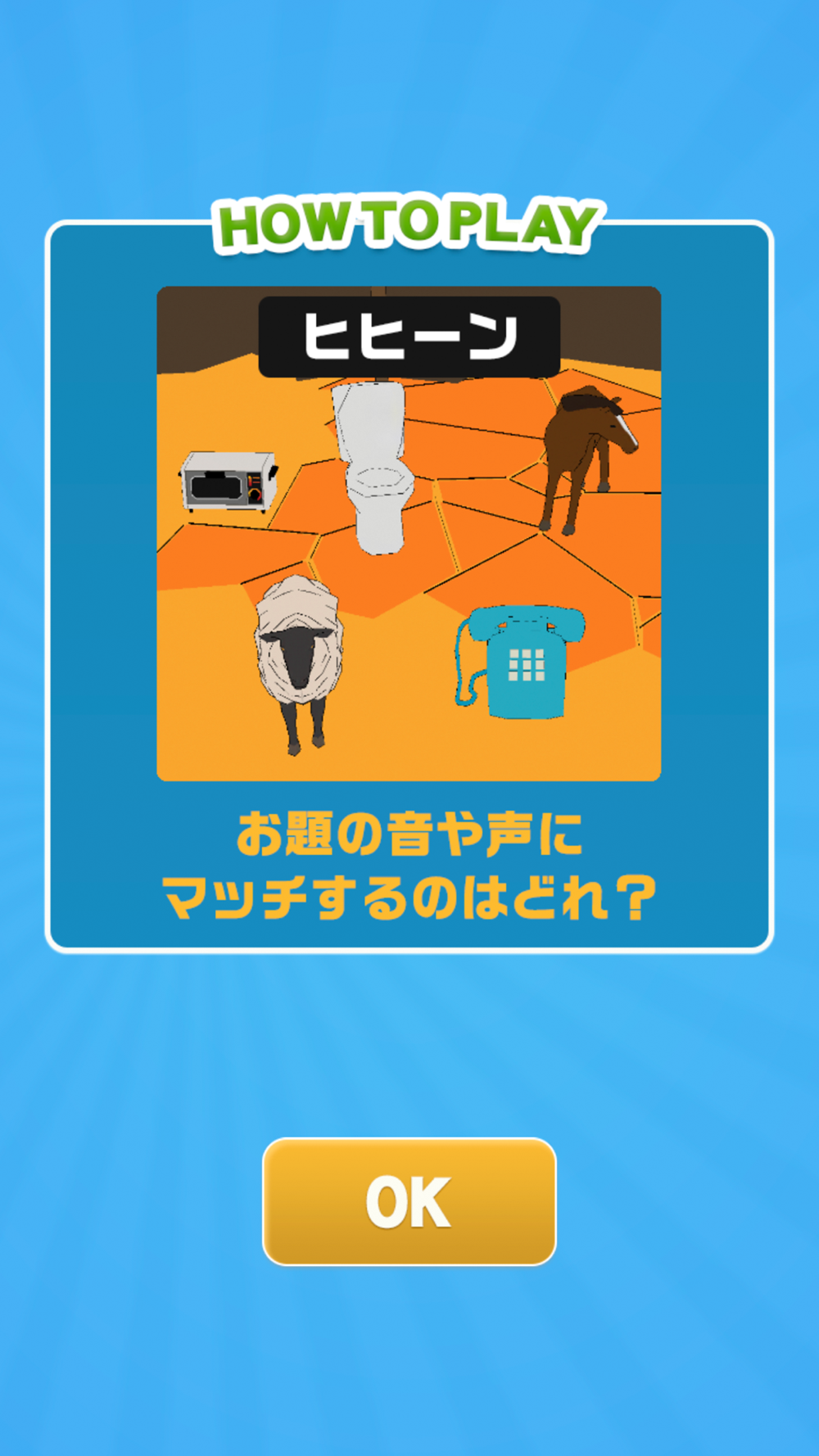 このアプリはお題に合ったオノマトペを当てるクイズゲームです。