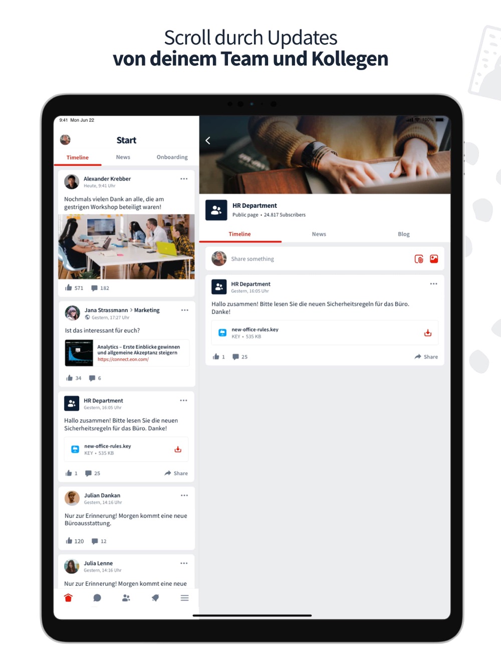 "Connect" is the social intranet platform of the E.ON group. In addition to the latest company news, it offers the opportunity to find relevant information on professional issues within a short time and to exchange information within the E.ON Group across companies and departments and regardless of the employee's location.