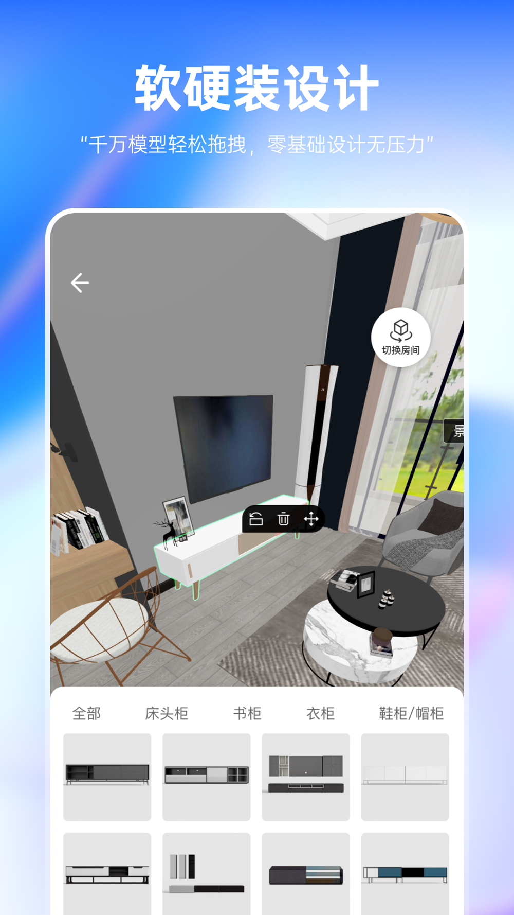 【手机完成设计】:软硬装千万模型构件任意布置设计,家居室内设计、全屋定制、橱衣柜定制、别墅工装等设计一网打尽。