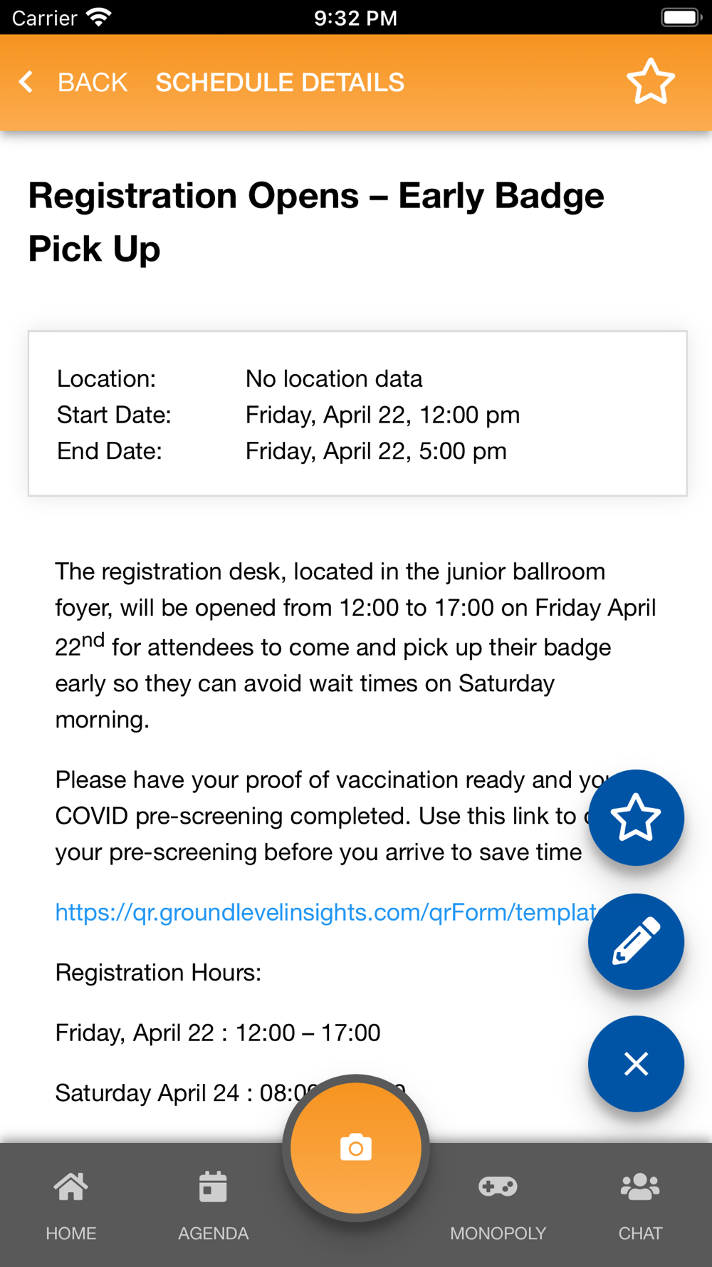 For contact sharing, scan the QR Code on the contact’s badge. Scanned contacts will save basic name information at the time of the scan. Users can select qualifiers or add notes for their scans. The app also allows the user to view, edit, or delete all scanned contacts.