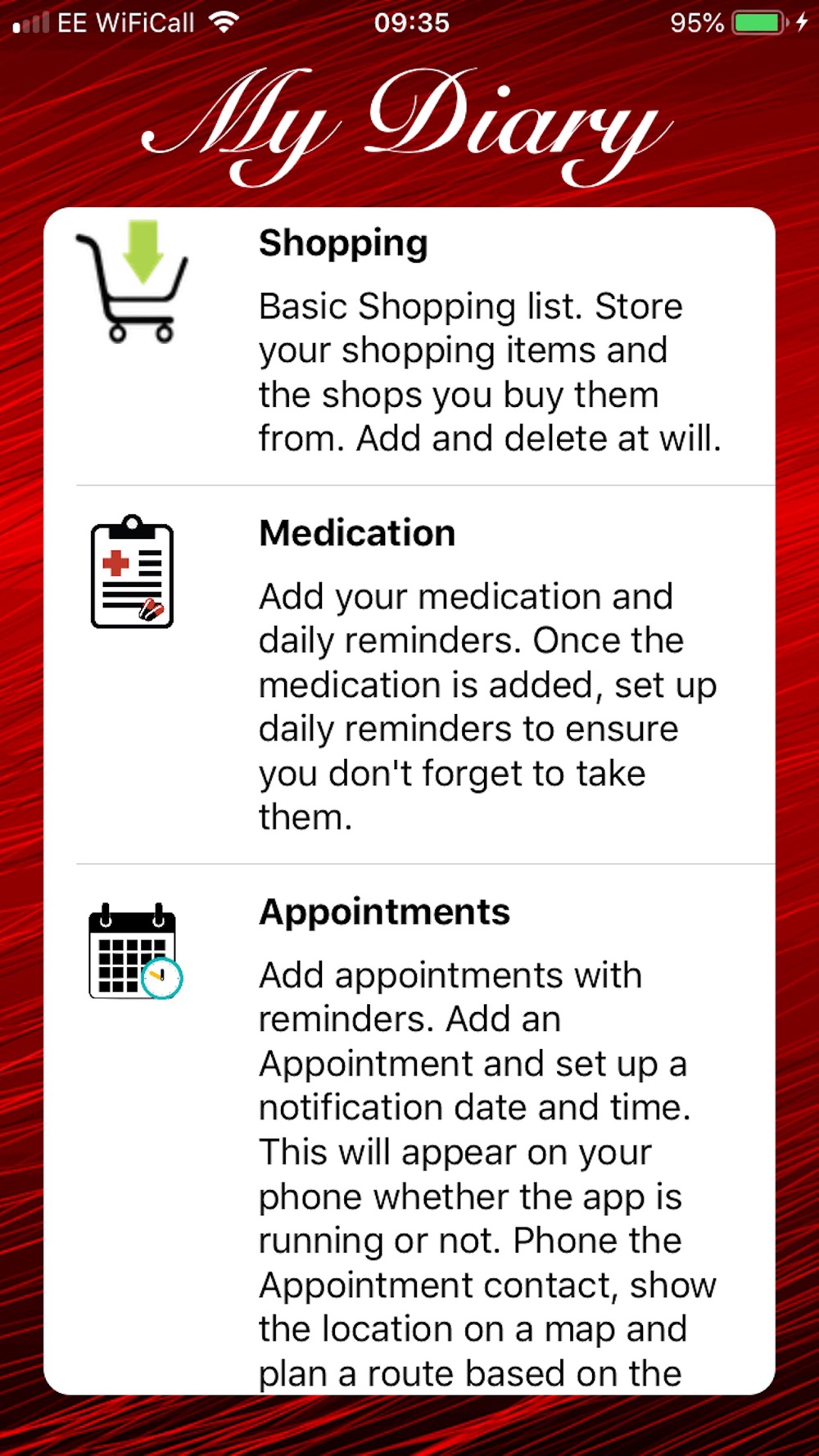 - Appointments: Add a list of upcoming medical appointments you may have. Set a reminder, show the location on a map and plan a route to it, list the directions and also phone the appointment from within the app.