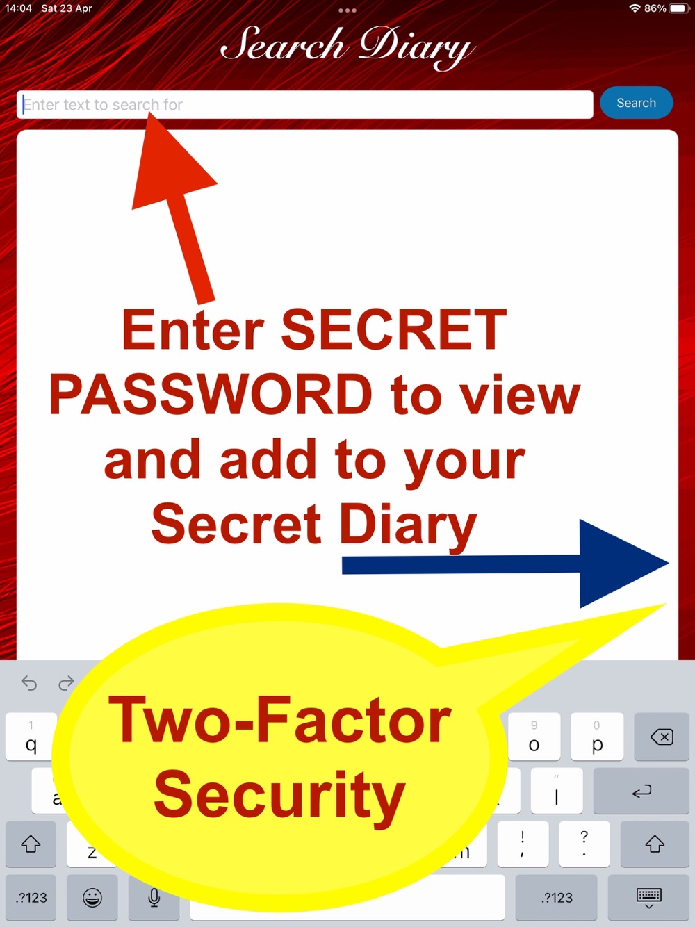 The Secret Diary is designed for iOS 12.3 and above so it is ideal for iPhone 6 and above. The diary has many features including a secret section which uses two-factor authentication. Firstly you have to use FaceID, Fingerprint Detection or the devices password to enter the Standard Diary. The second authentication is in the Search Diary feature. When you purchase the app, there is a section to set up your password which, when set up, the feature disappears and will never be shown again. Not even if you delete and and reinstall the app. In the Search Diary feature, enter your secret password to complete the two-factor authentication and enter the Secret Diary side of the app.