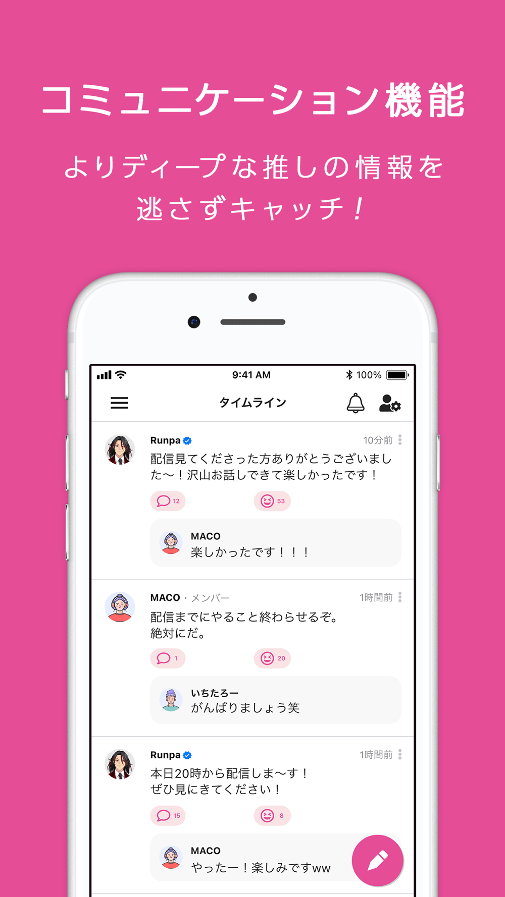 推しとの交流 「VFave」では推しからの投稿を見ることができ、ファンは自由にコメントを投稿し、推しとやり取りすることが可能です。 時に、推しのよりディープな情報が流れてくることも!