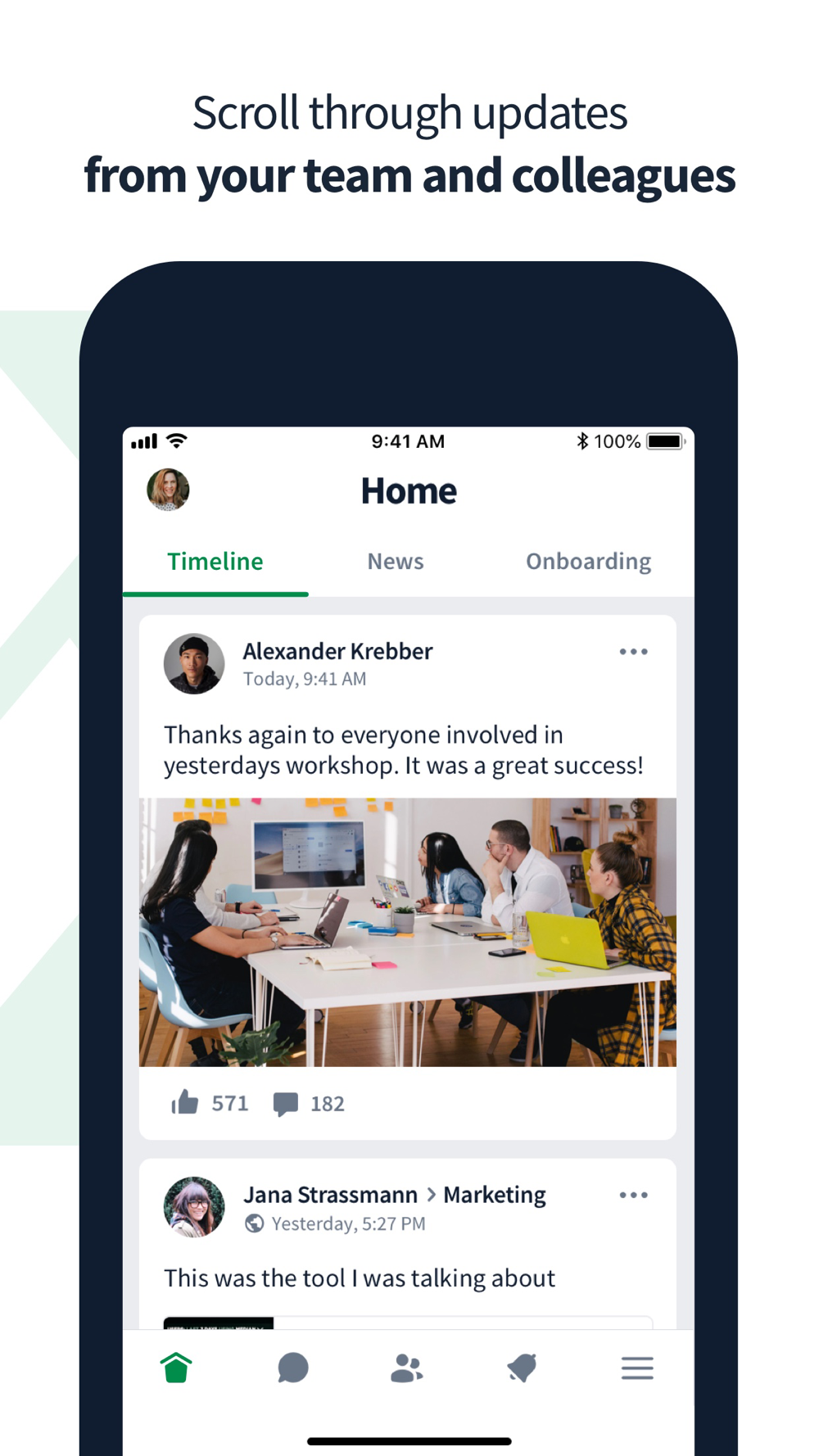 With the app, you can easily find out about the latest company news or see which topics are currently relevant for your colleagues - thanks to the app, even without a fixed desktop workstation or work cell phone, because you can also use the app on your private cell phone.