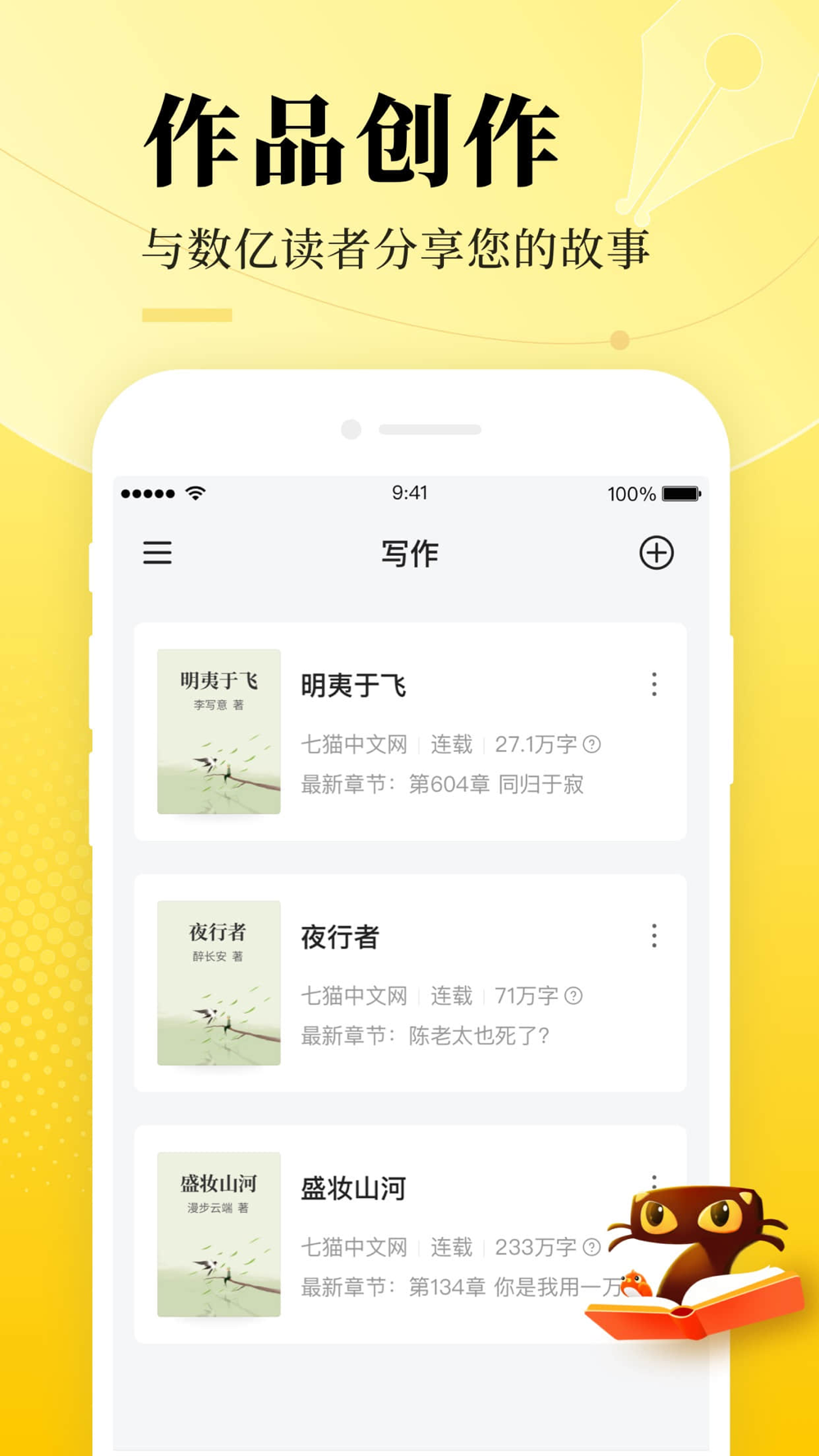 作品创作:支持创建作品,便捷发布、修改章节、保存草稿