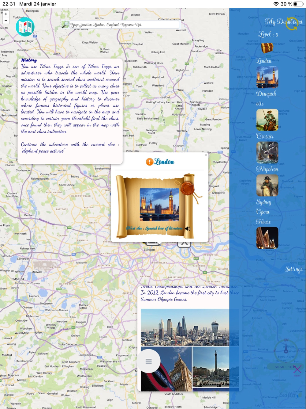You play as an explorer adventurer who must travel the world in search of the famous Templar treasure. However, during your quest you will have to follow a route through several countries and find clues. Each discovery will give you a clue for your next destination. This very fun game will allow you to improve your knowledge of history and geography. Intended for the youngest to deepen your skills in general culture or for the oldest who wish to improve their research capacities from a map.