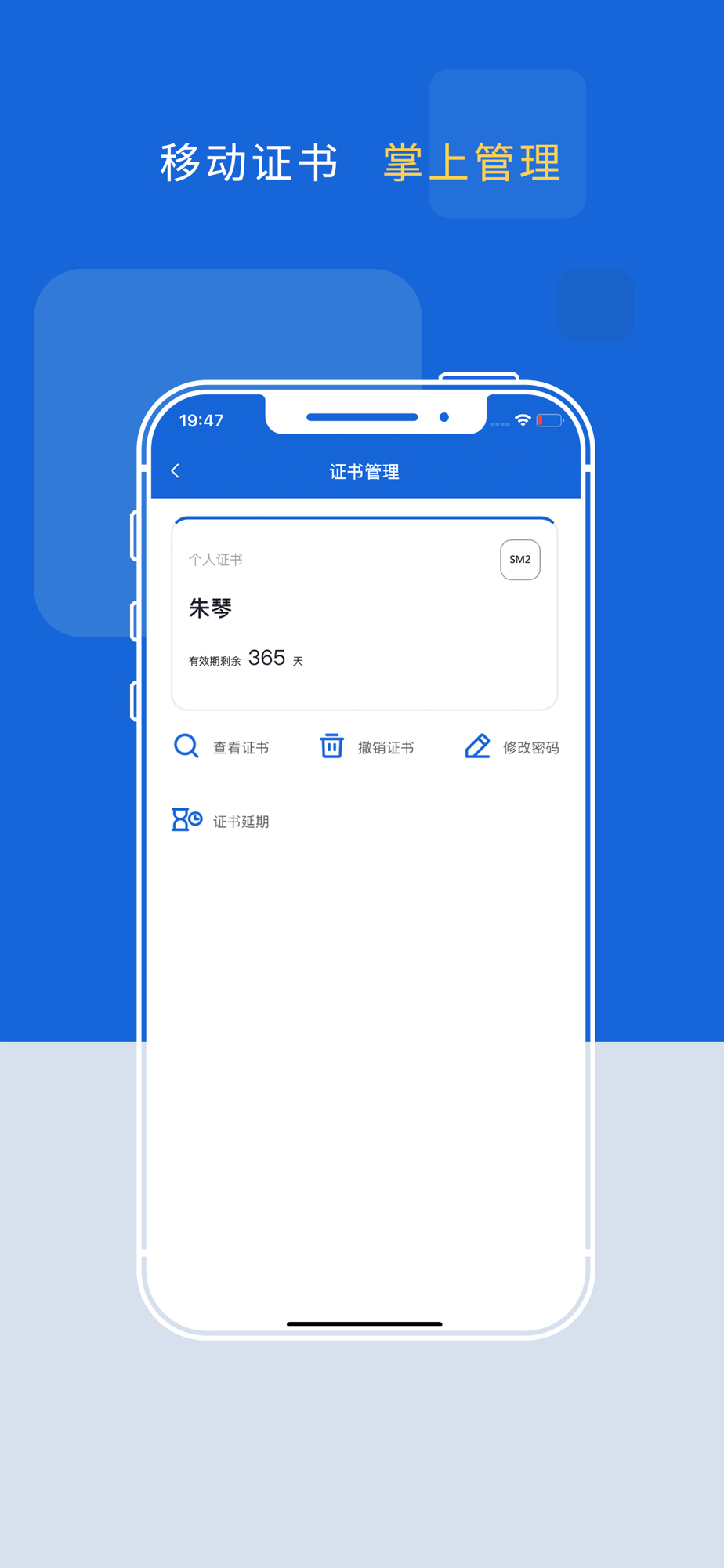 移动数字证书存储在手机,随身携带、安全保存、被授权后随时使用。