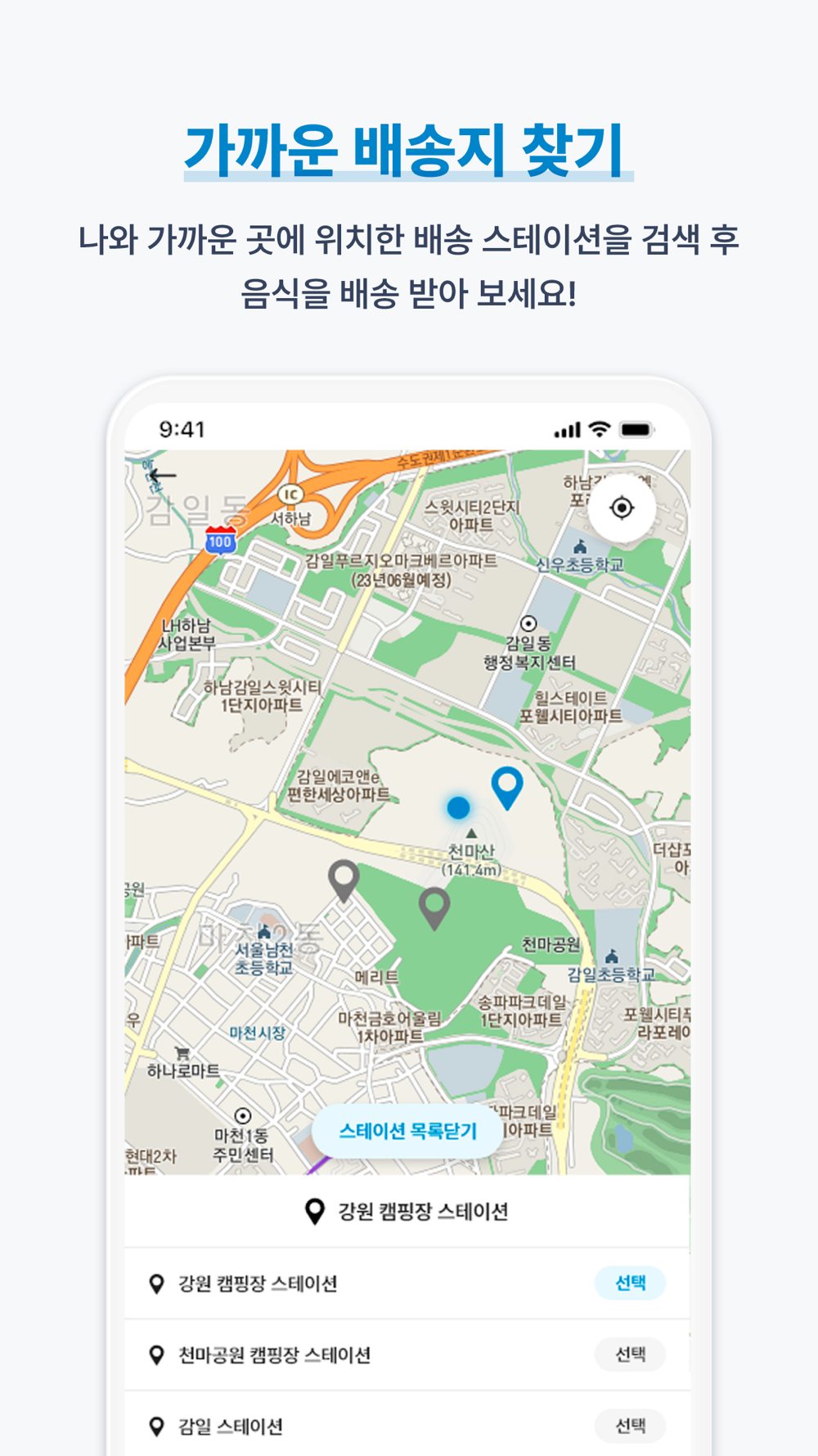 나와 가까운 곳에 위치한 배송 스테이션을 검색 후 음식을 배송 받아 보세요!