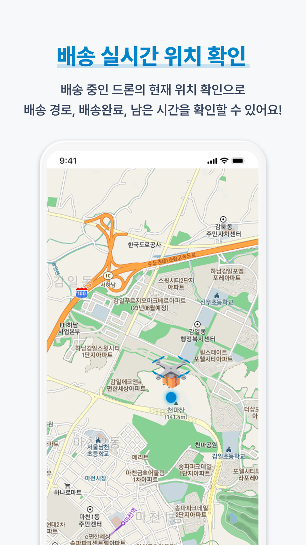 배송 중인 드론의 현재 위치 확인으로 배송 경로와 배송완료까지 남은 시간을 확인할 수 있어요!