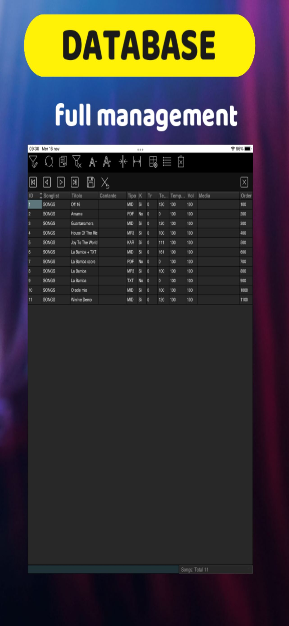- Management of 40 SongLists with possibility to book next song or more song on a temp songlist ( F10 )