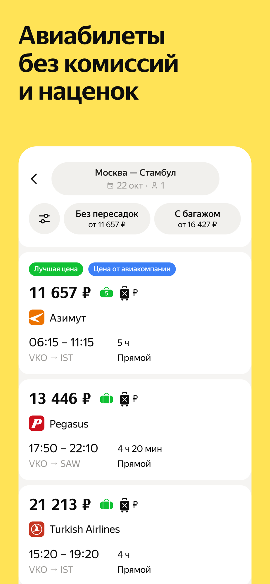 Если вы еще сомневаетесь, где вас ждут самые дешевые авиабилеты, просто зайдите в приложение, введите даты, пункт назначение и убедитесь сами. Яндекс Путешествия работает с авиакомпаниями напрямую, позволяя вам совершить самый выгодный заказ авиабилетов без наценок и комиссий.