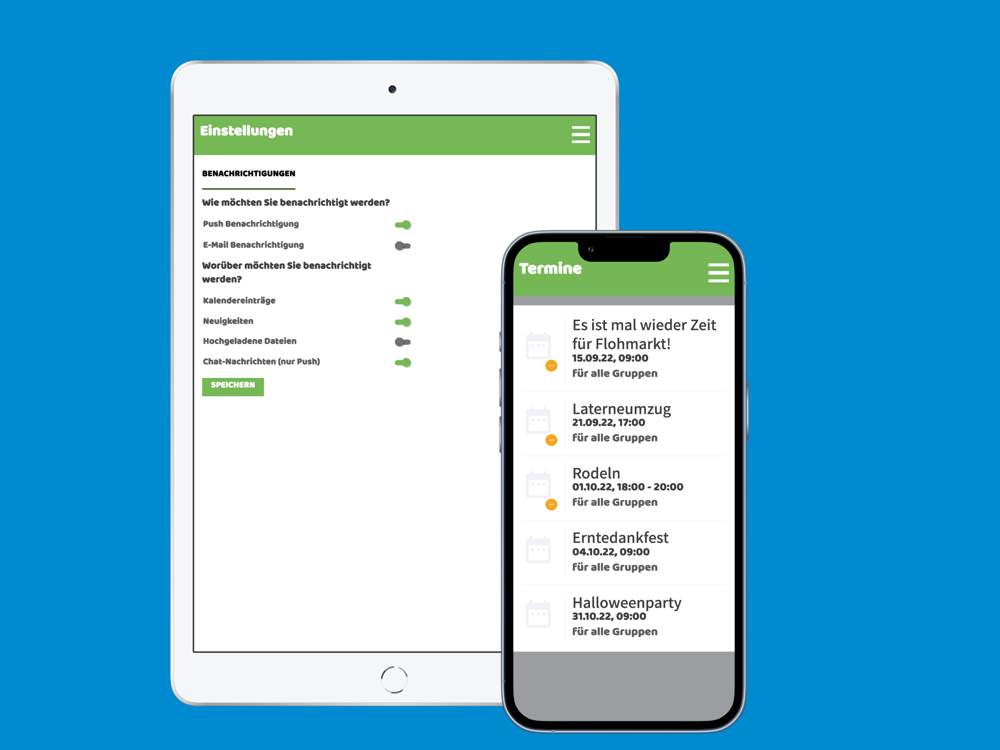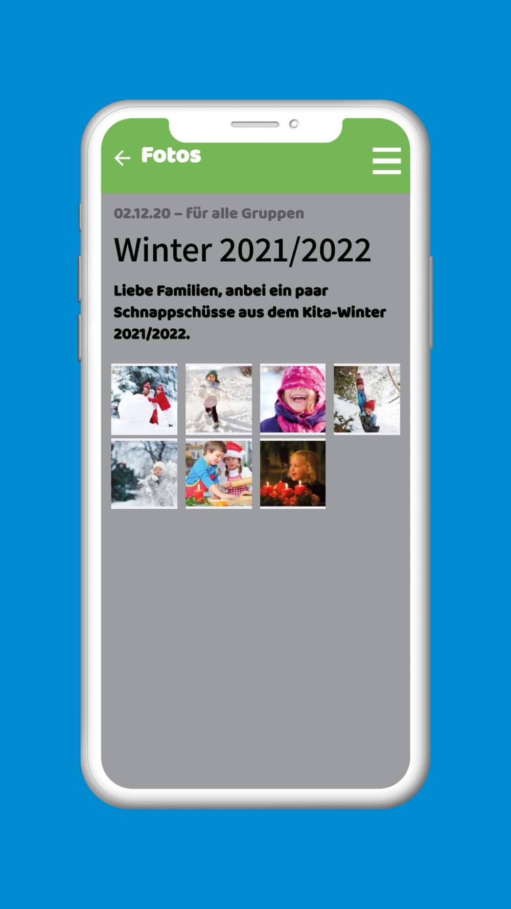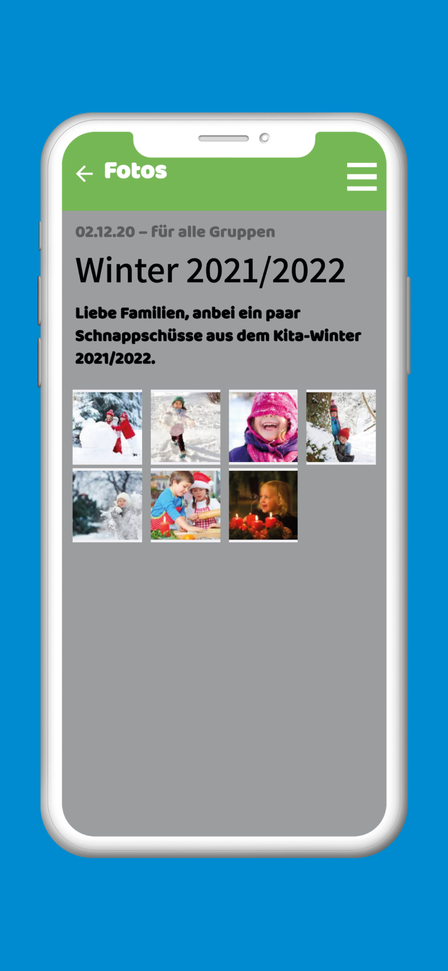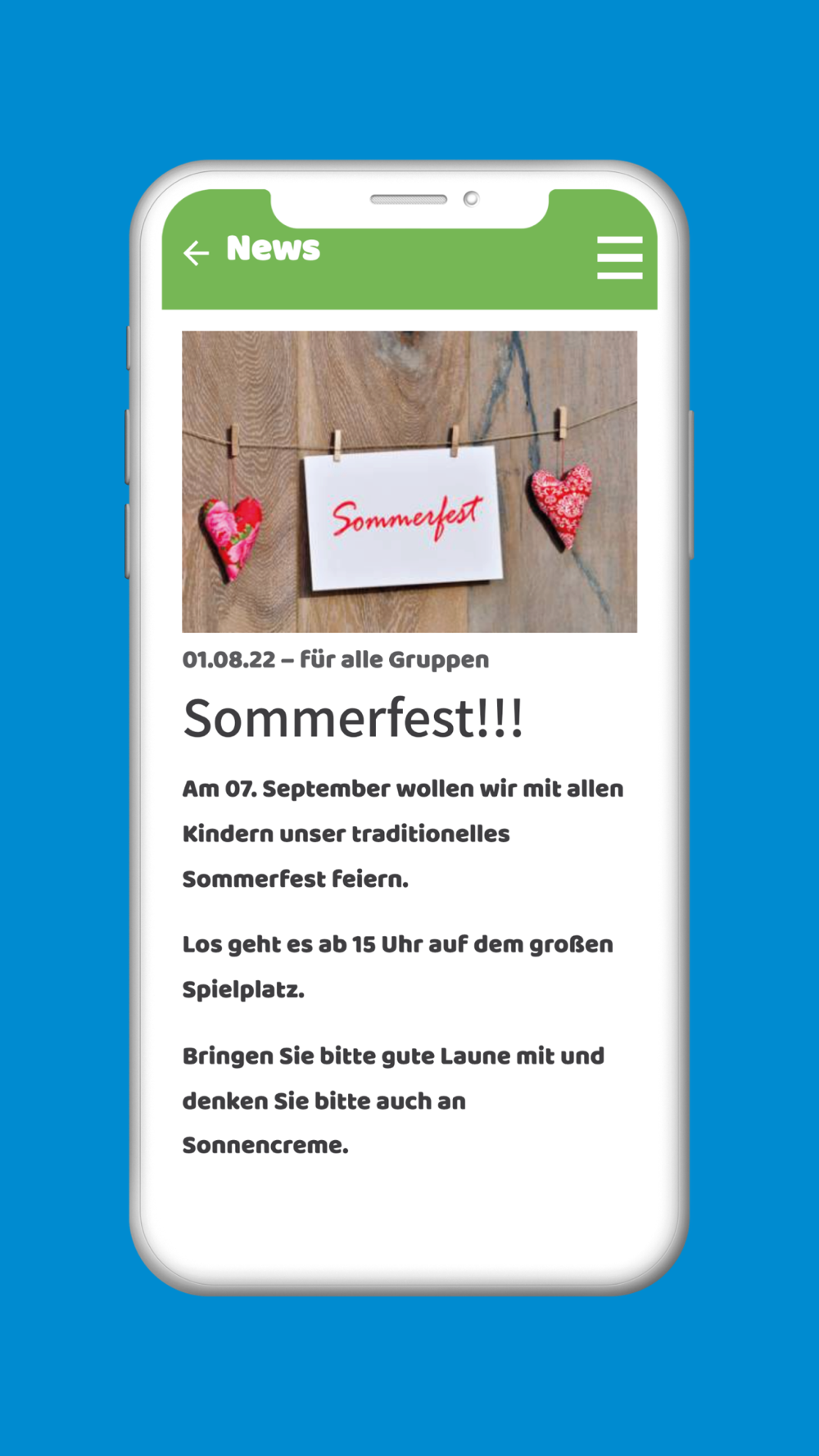 Automatisch per E-Mail oder Push-Nachricht - Sie bestimmen selbst, ob und wie Sie über Kalendereinträge, Neuigkeiten oder hochgeladene Dateien informiert werden möchten. Nutzen Sie jederzeit den Zugriff auf Nachrichten, den wöchentlichen Speiseplan, Fotoalben und Termine. So sind Sie stets auf dem Laufenden und haben auch unterwegs Einblick in den Tagesablauf Ihrer Kinder im Kindergarten.