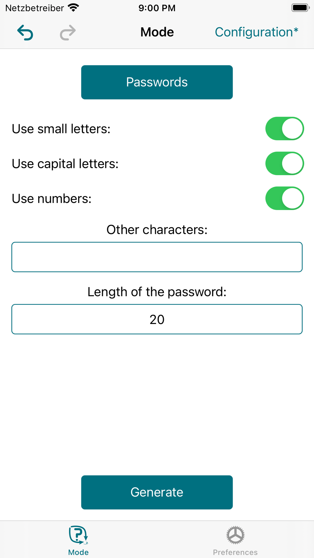 - Password: Have a random password generated from lowercase letters, uppercase letters, numbers and self-defined special characters. The minimum length of the password is 4 and can have a maximum of 1024 characters.- Words: Define at least two different words and let ADchosA 3 return one of them randomly.