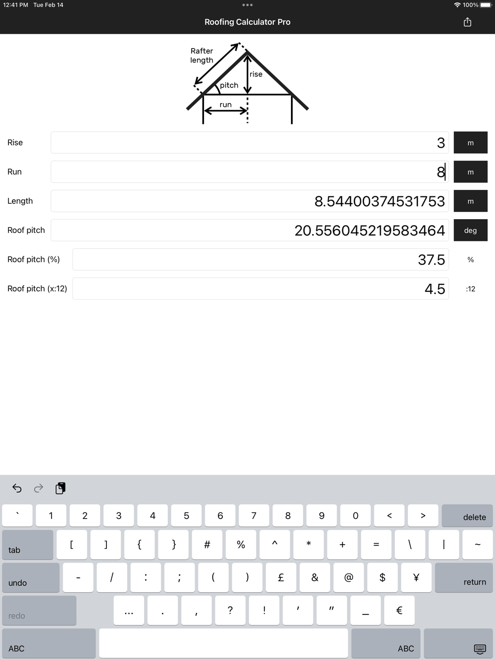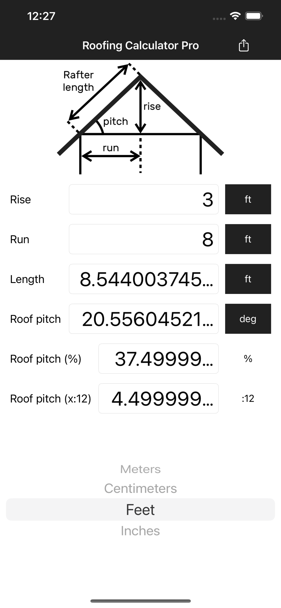 Roofing Calculator Pro can also quickly determine Roof Pitch and Rafter Length based on Rise and Run expressed in:
