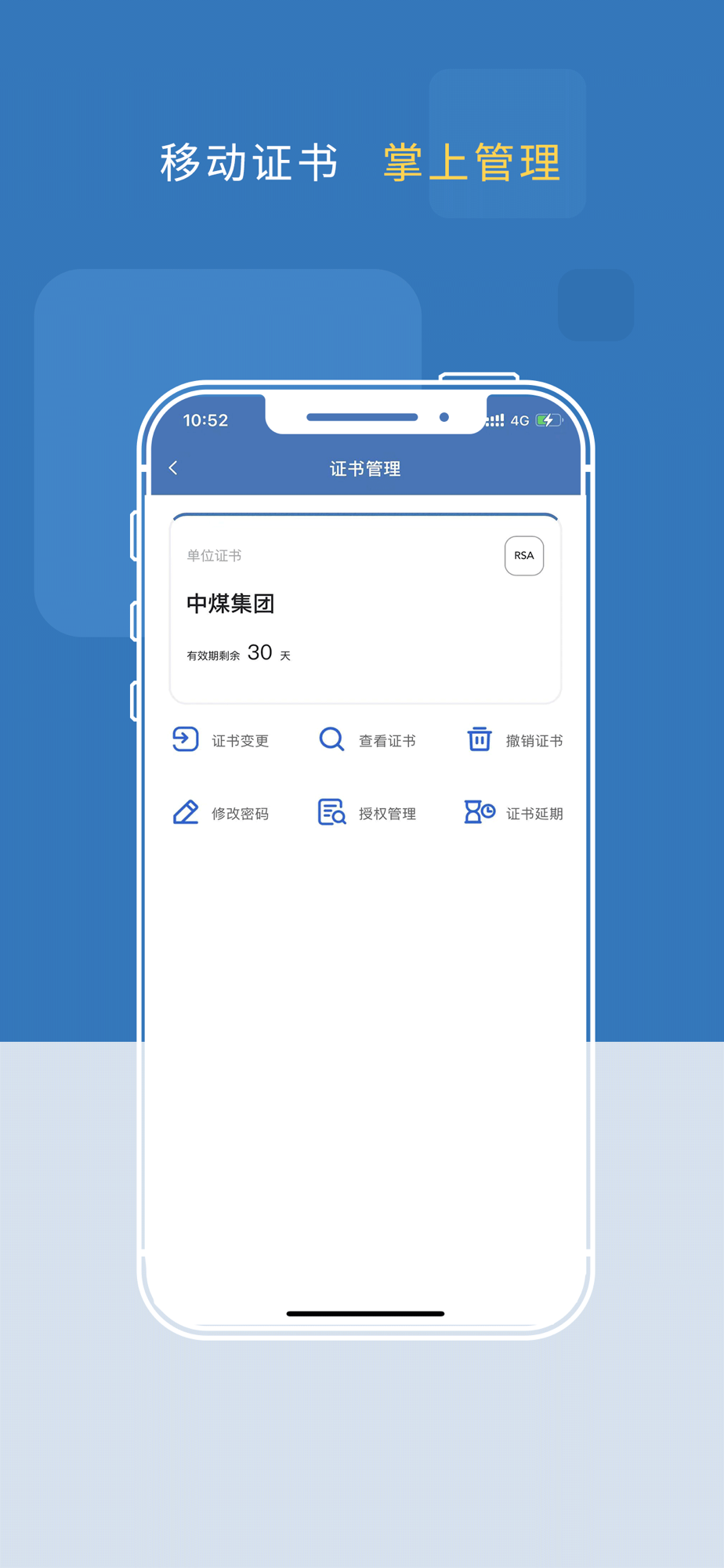 “中煤易购”APP是服务中煤集团的移动证书产品。用户可通过APP在线申请移动数字证书和电子印章,完成在电子招投标和电子合同签署过程的扫码登录、扫码签章、扫码加密、扫码解密等业务操作。
