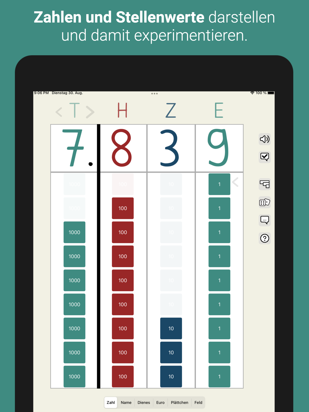 Mit dieser App kannst du große und kleine Zahlen und die Bedeutung der Stellenwerte interaktiv erforschen. Es ist keine Übungsapp, sondern eine Experimentierumgebung.