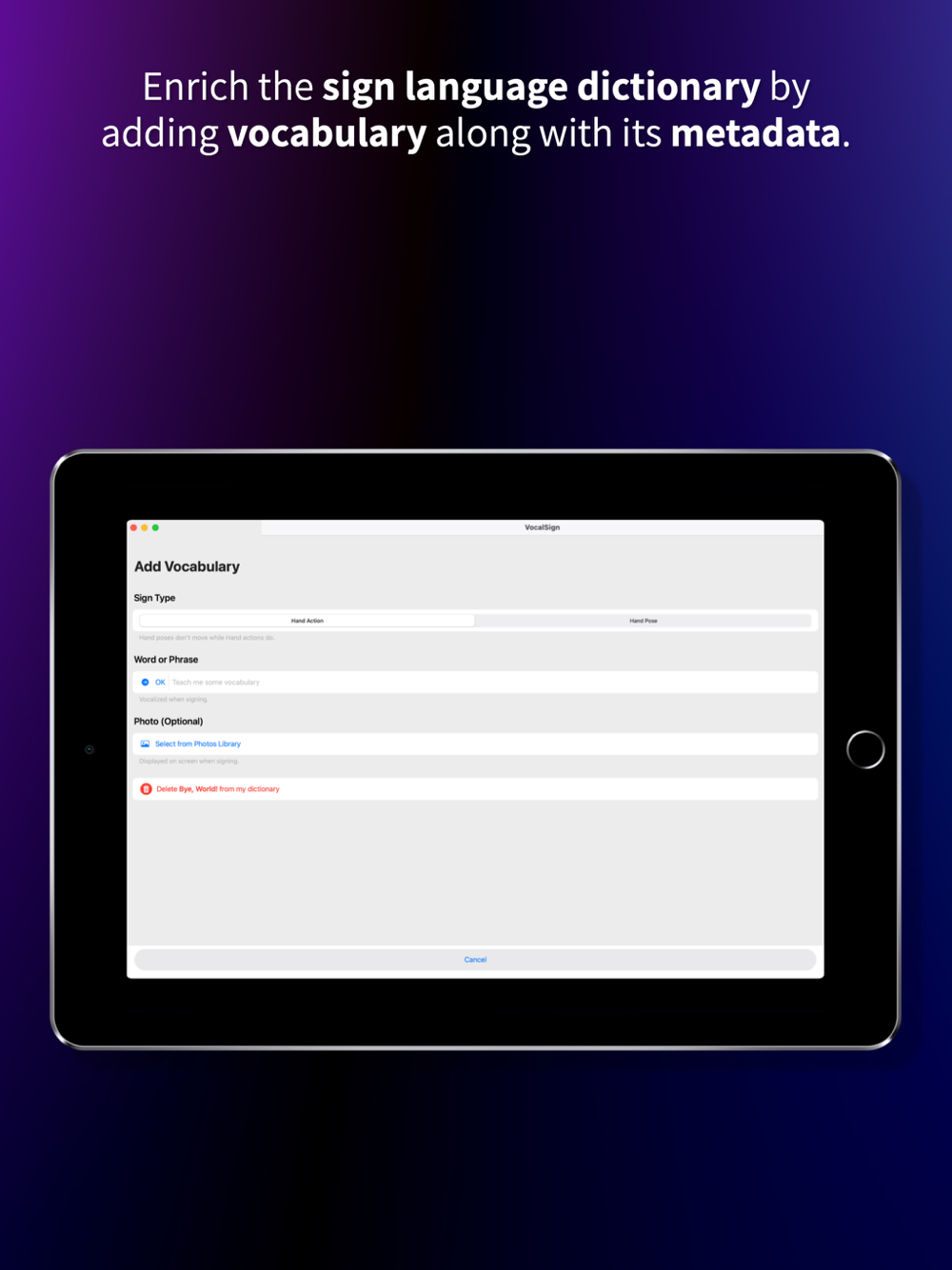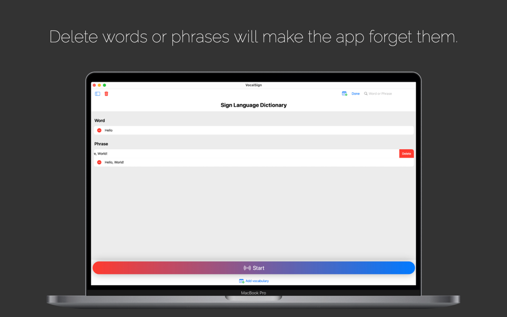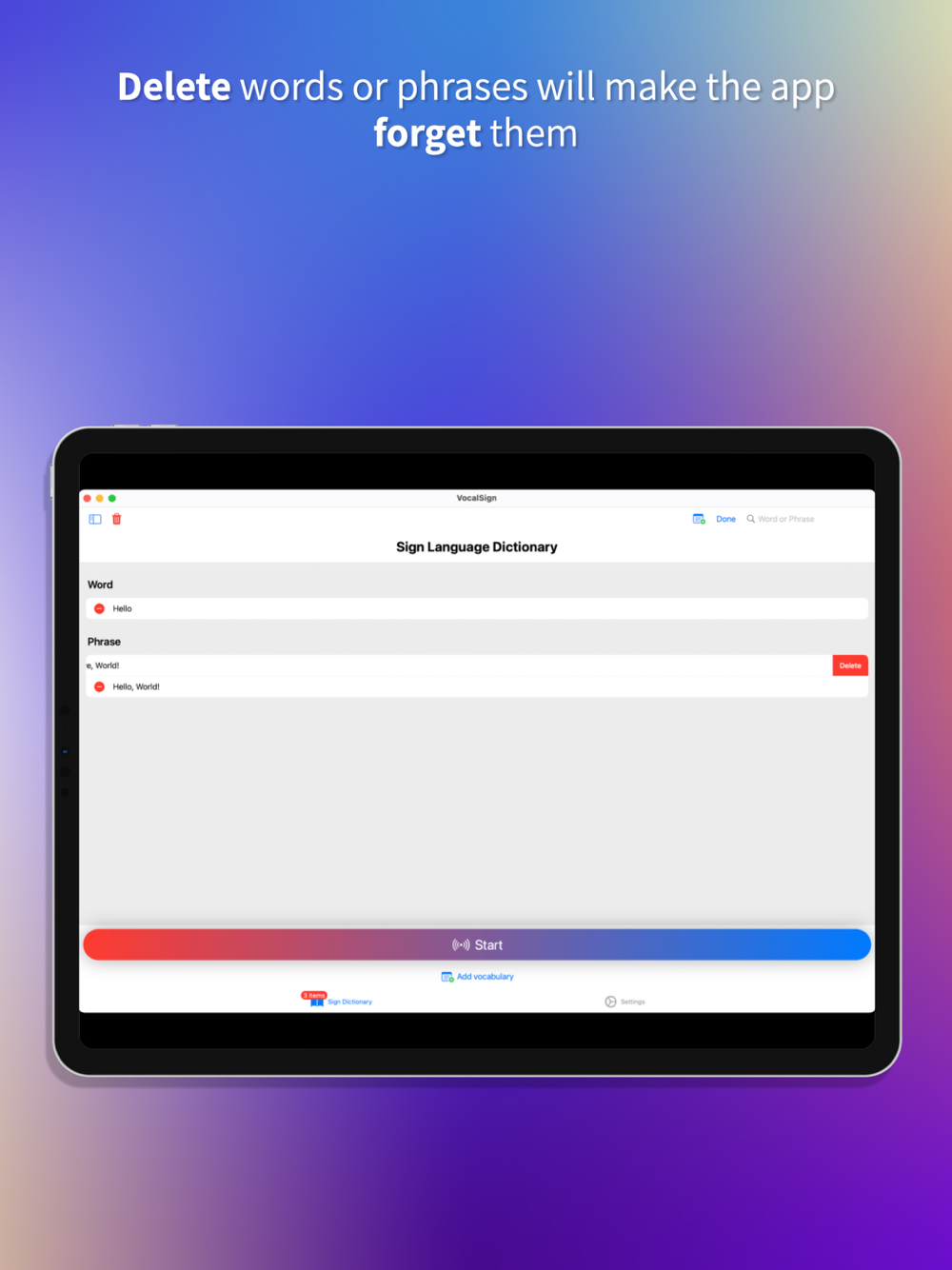 This is a dance of mutual growth; as VocalSign sharpens its acumen with every sign you introduce, it mirrors the diversity embodied in over 300 sign languages. This reciprocal refinement forges an upward spiral of perpetual enhancement. And in the quest for precision, removing an entry is just as intuitive, safeguarding a repository of only the most precise and beneficial signs.