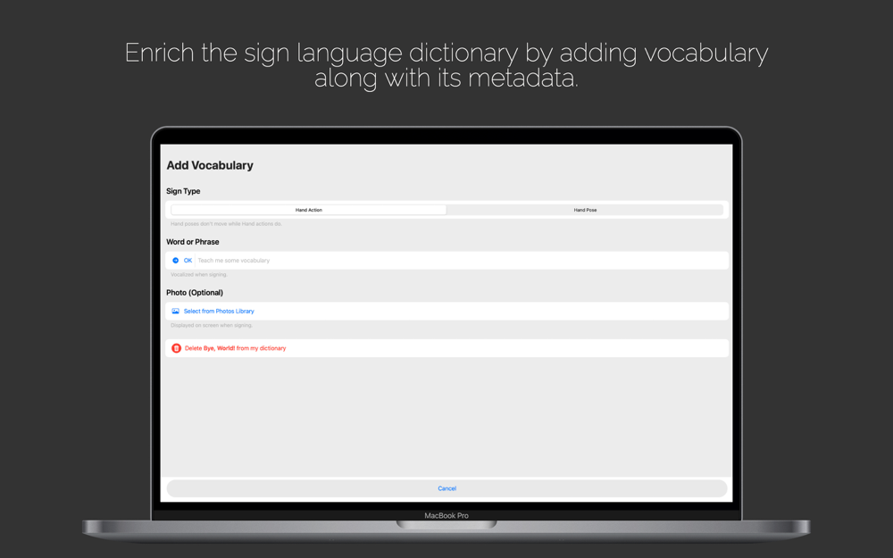 At the core of VocalSign lies a robust sign language lexicon, ever-eager for your contribution. Here, you are the sculptor of knowledge, adding new words, selecting imagery that resonates with your signs, and detailing the nuances of every motion, whether it involves one hand or two, or a particular sweep of the palm. Currently, VocalSign discerns 10 hand actions, with our sights set on broadening this horizon.