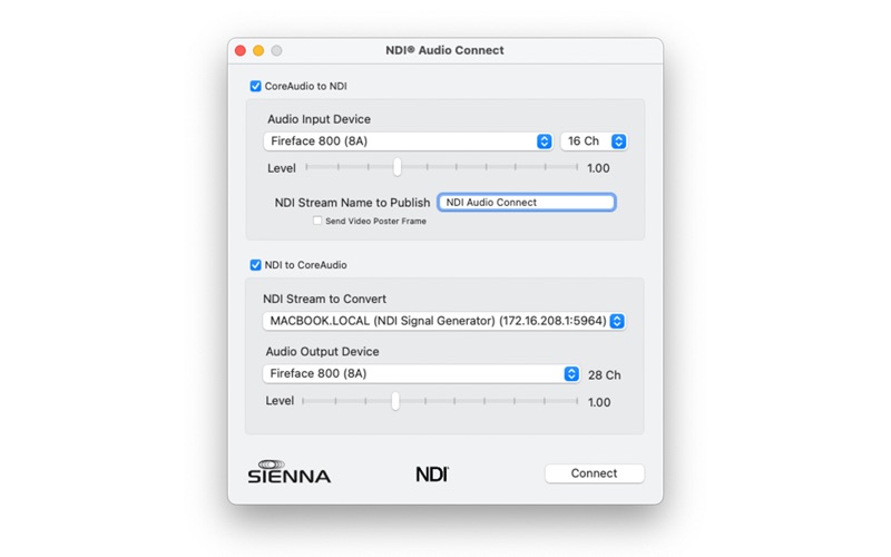 NDI Audio Connect is the simple, yet powerful tool to convert CoreAudio into NDI and NDI back to CoreAudio.