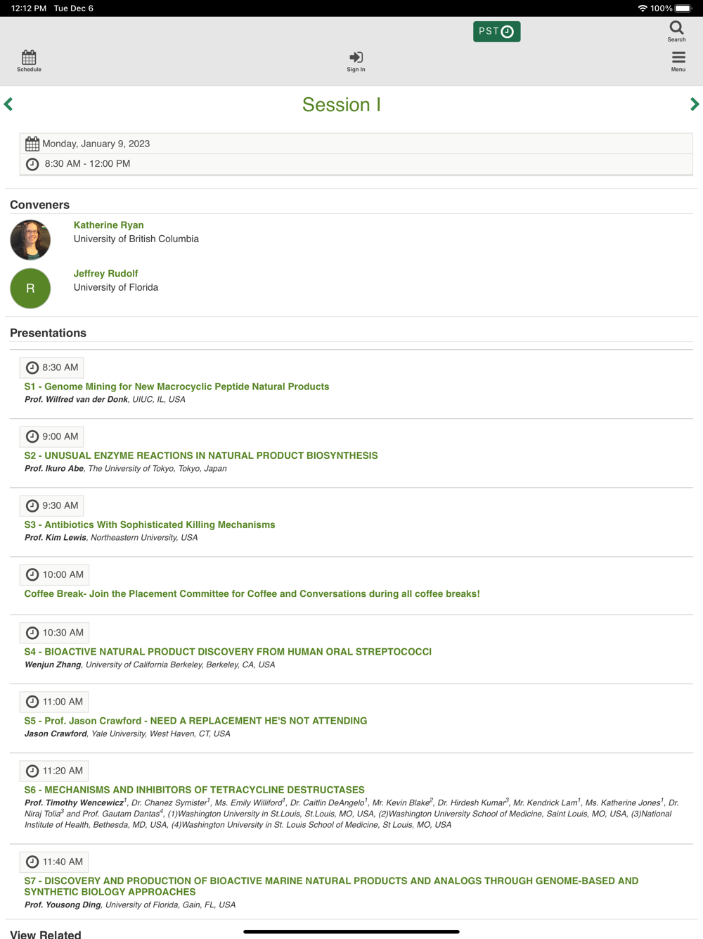 The 4th International Conference on Natural Product Discovery and Development in the Genomic Era will be held January 8th - 12th, 2023, in San Diego, CA. Login to view Sessions and Papers saved as favorites. View schedules, locations, floor plans, and people. Attendees will now be able to facilitate their experience at the meeting using the mobile app.