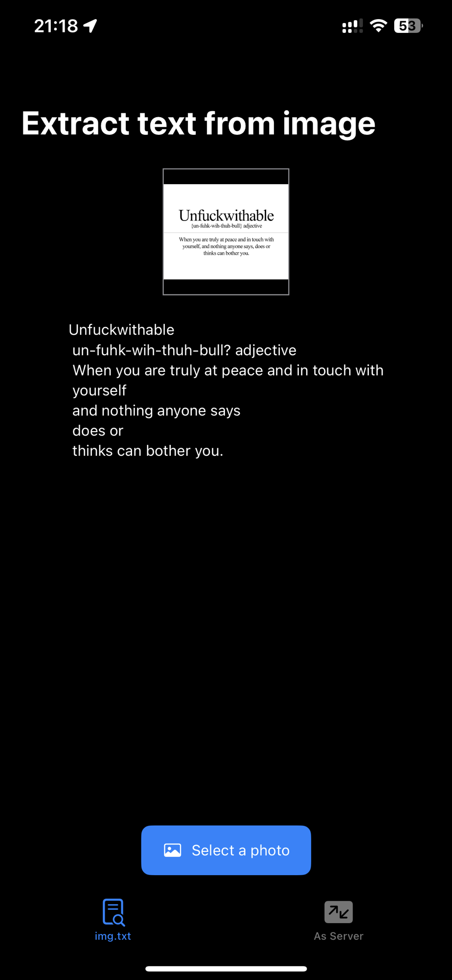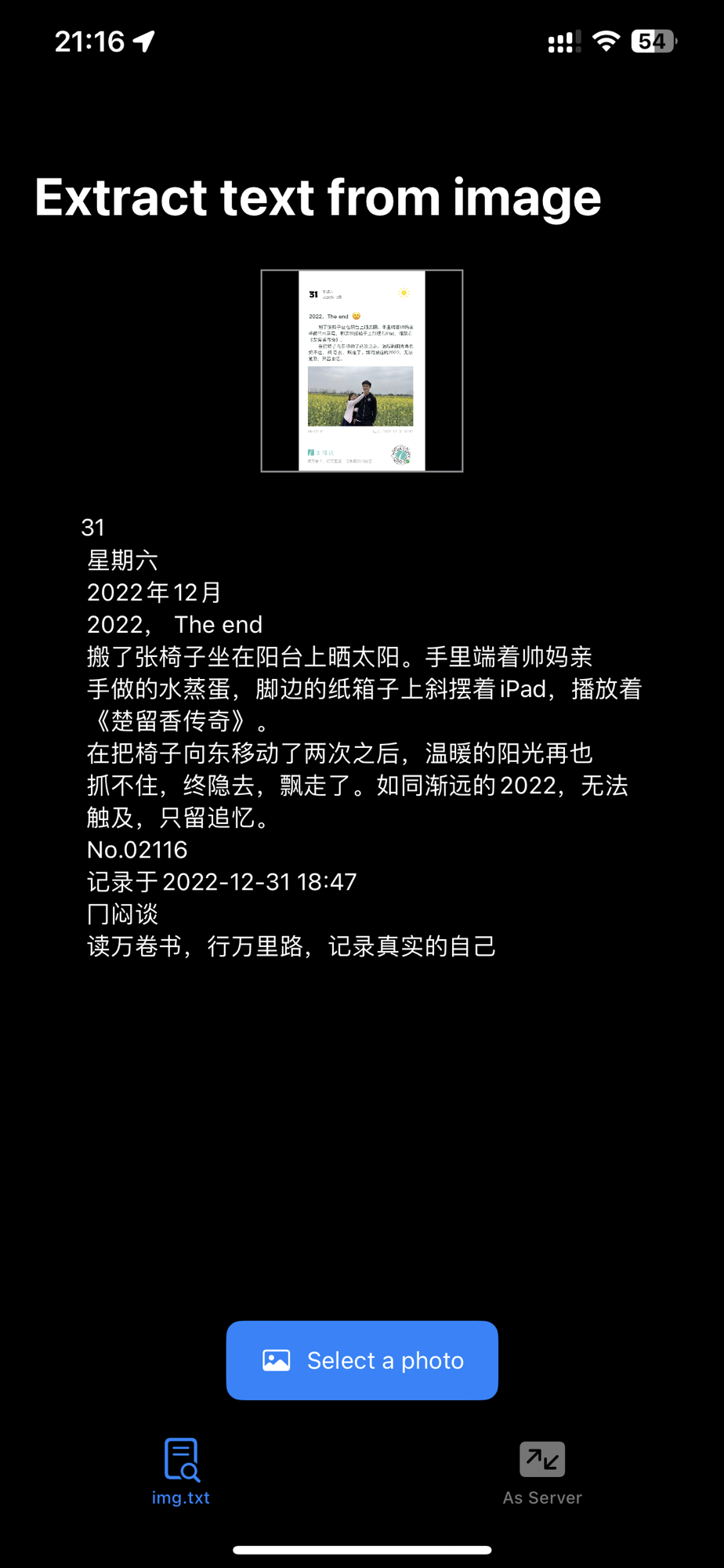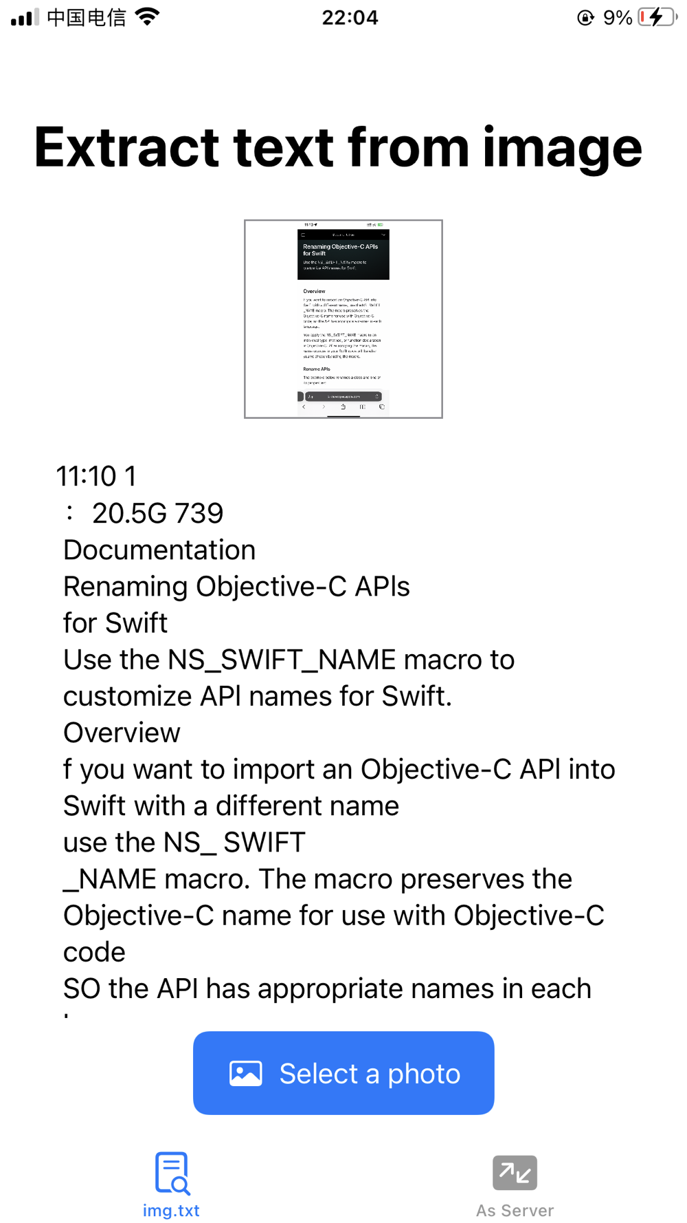 Use img.txt, easy get text content from image, and You can use iPhone as OCR server, it provides a POST API to receive image and return OCR result directly.