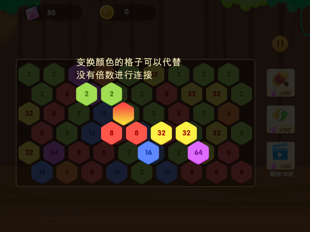 2.连接任意两个相同数字作为开始,之后的数字可以为继续上一个数字或者该数字的倍数数字相连消除。