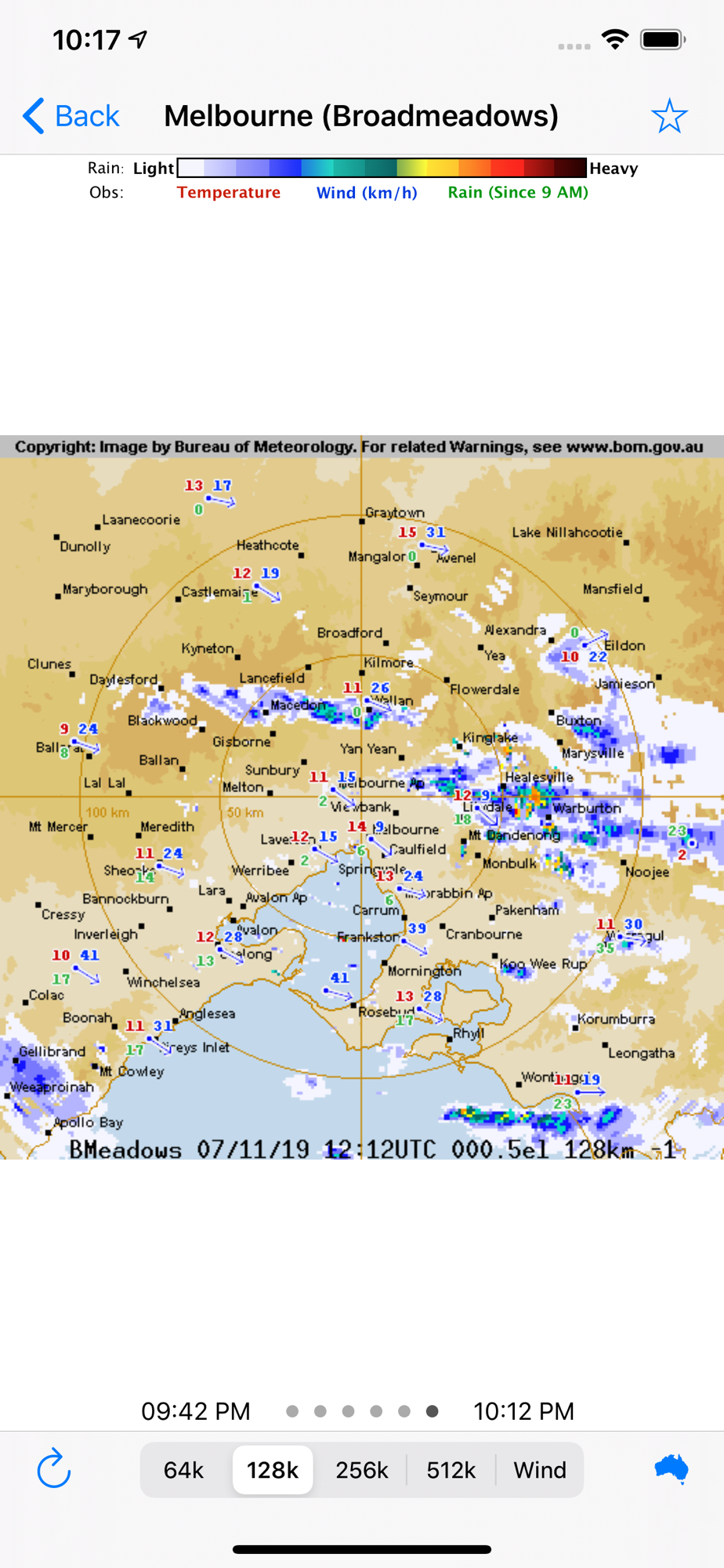Ever find yourself wandering around Australia somewhere and seeing those grey clouds on the horizon and wonder if you're going to make it to cover in time? Or if you need to go buy another umbrella on your way home? RainRadarAU (formerly BOMRadar) can help. Displaying a sequence of real time radar images sourced from the Bureau of Meteorology, RainRadarAU shows the direction and intensity of the rain on your selected radar. With this information you can judge how long it will take for rain to reach you, and maybe when a gap will appear for you to escape.