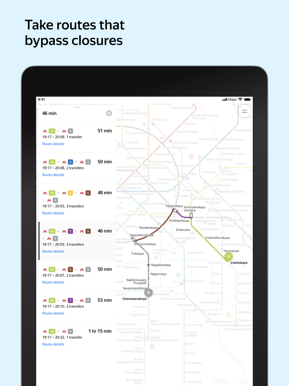 Yandex Metro shows you how long a journey will take, the number of transfers and whether any stations are closed for renovations. It shows which metro car to choose to speed up your trip and not waste time when changing lines.