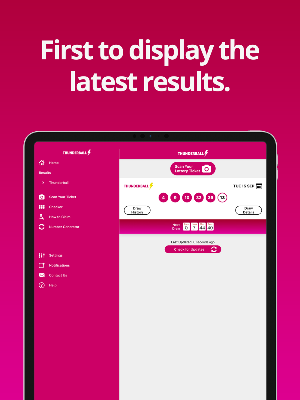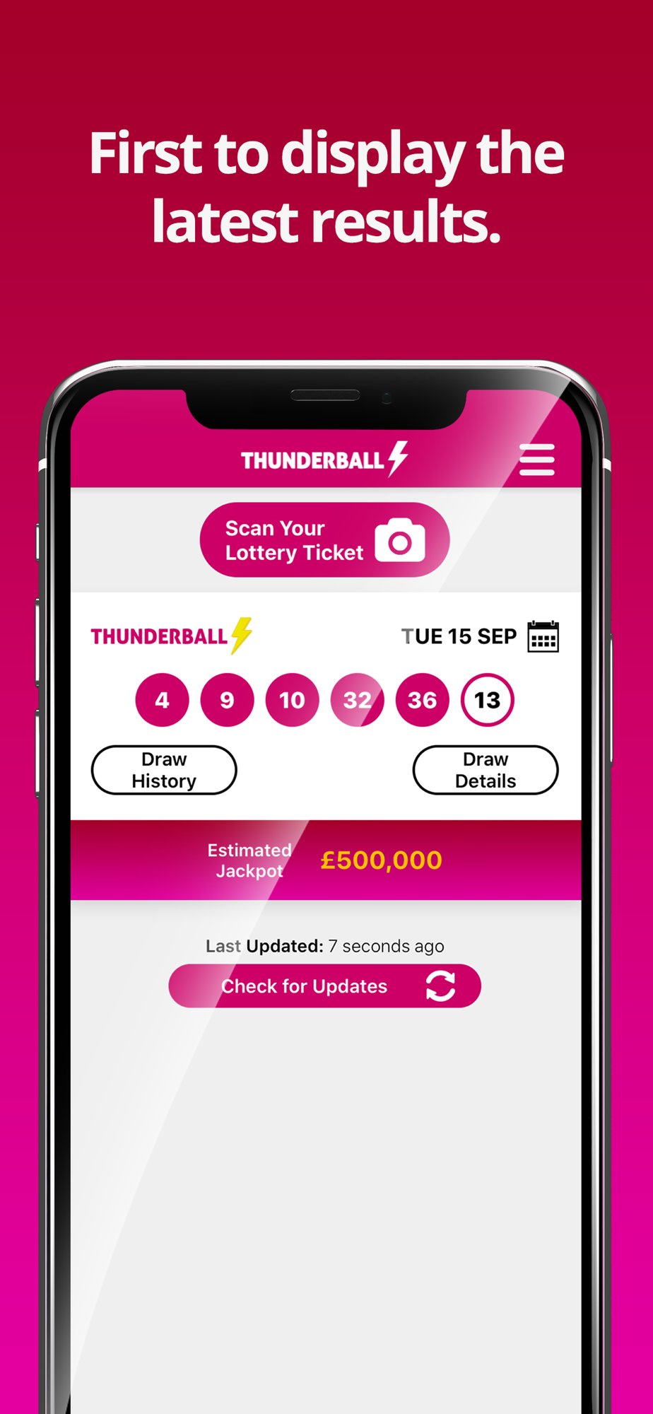 Get the latest Thunderball results within seconds of the draws taking place. This easy-to-use app shows the National Lottery numbers, prize breakdown information and jackpots for Thunderball.