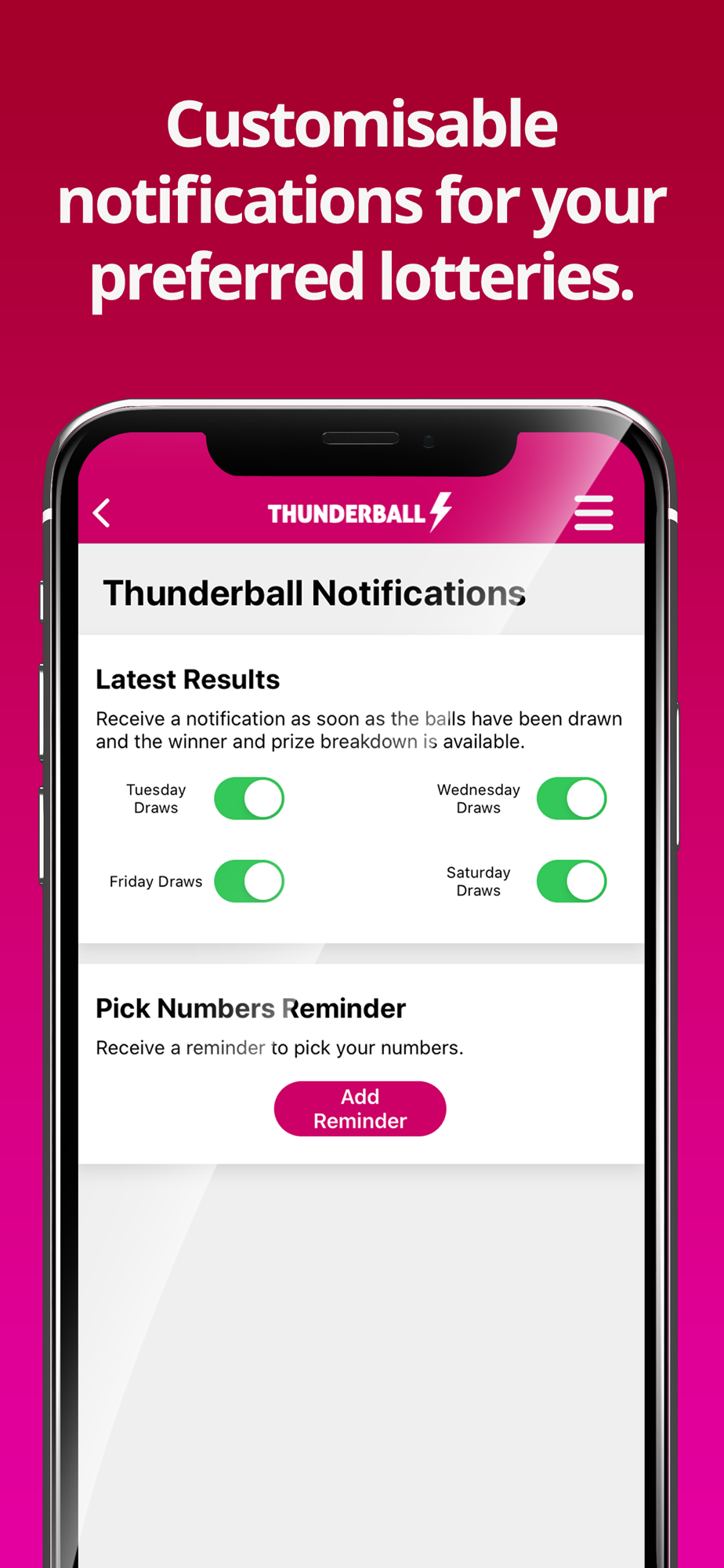 Get notified instantly when the latest Thunderball results and prize breakdowns become available. The App allows you to customise notifications so you can also choose which days of the week you play. Want to know when the jackpot has rolled over or has reached a certain amount? Just head to the Notification section of the app to set up your alerts. There is also the option to set notifications at times that suit you - great for reminding you to purchase tickets before the draw.