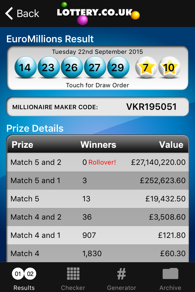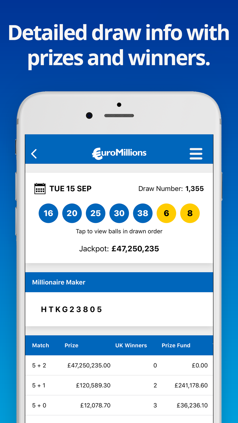 Get the latest EuroMillions results within seconds of the draws taking place. This easy-to-use app shows the National Lottery numbers, prize breakdown information and jackpots for EuroMillions (including UK and European Millionaire Maker).