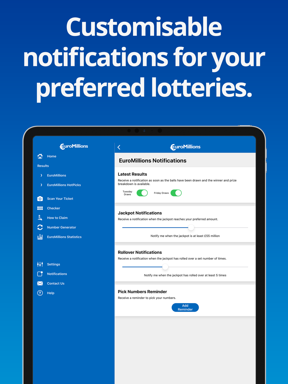 Get notified instantly when the latest EuroMillions results and prize breakdowns become available. The App allows you to customise notifications so you can also choose which days of the week you play. Want to know when the jackpot has rolled over or has reached a certain amount? Just head to the Notification section of the app to set up your alerts. There is also the option to set notifications at times that suit you - great for reminding you to purchase tickets before the draw.