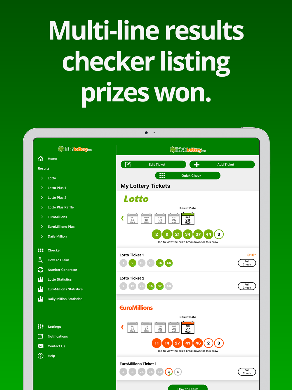 Enter and save your chosen numbers to see if you have won or to see how often they have come up in the past. You can also label your tickets – great if you play multiple lines or if you run a syndicate. The ticket checker also highlights prizes won on each ticket as well as calculating the total for each lottery. Only play lotteries on certain days of the week? Not a problem, you can exclude your checked tickets from draws you do not play.
