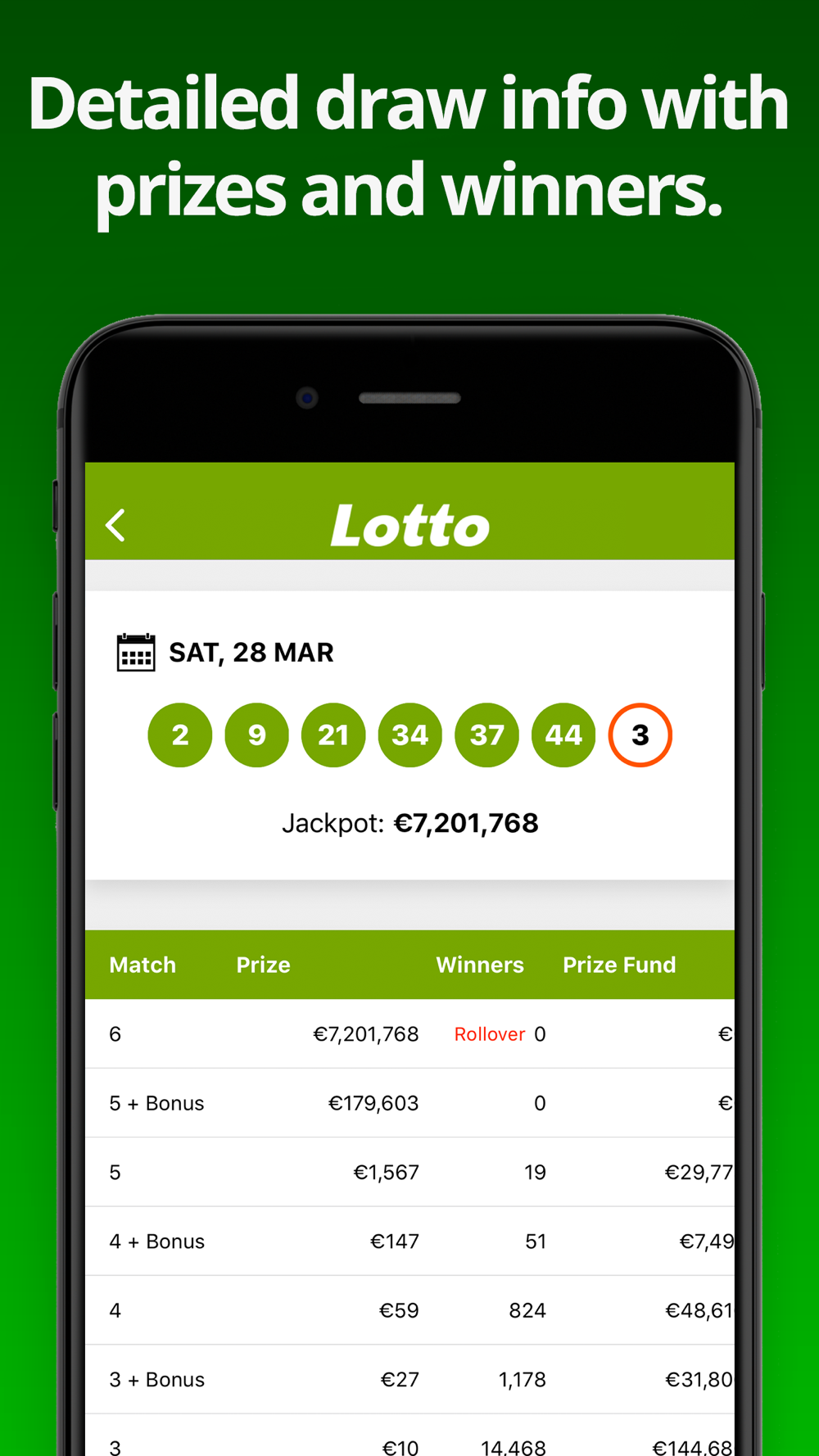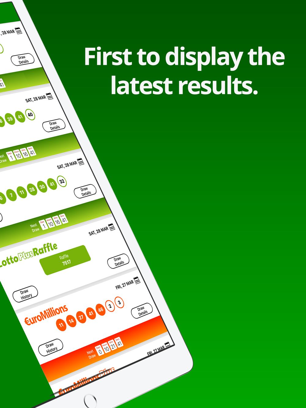 Get the latest Irish Lotto results within seconds of the draw taking place. This easy to use app shows the National Lottery numbers and full prize breakdowns including number of winners and prizes paid for the following lotteries: