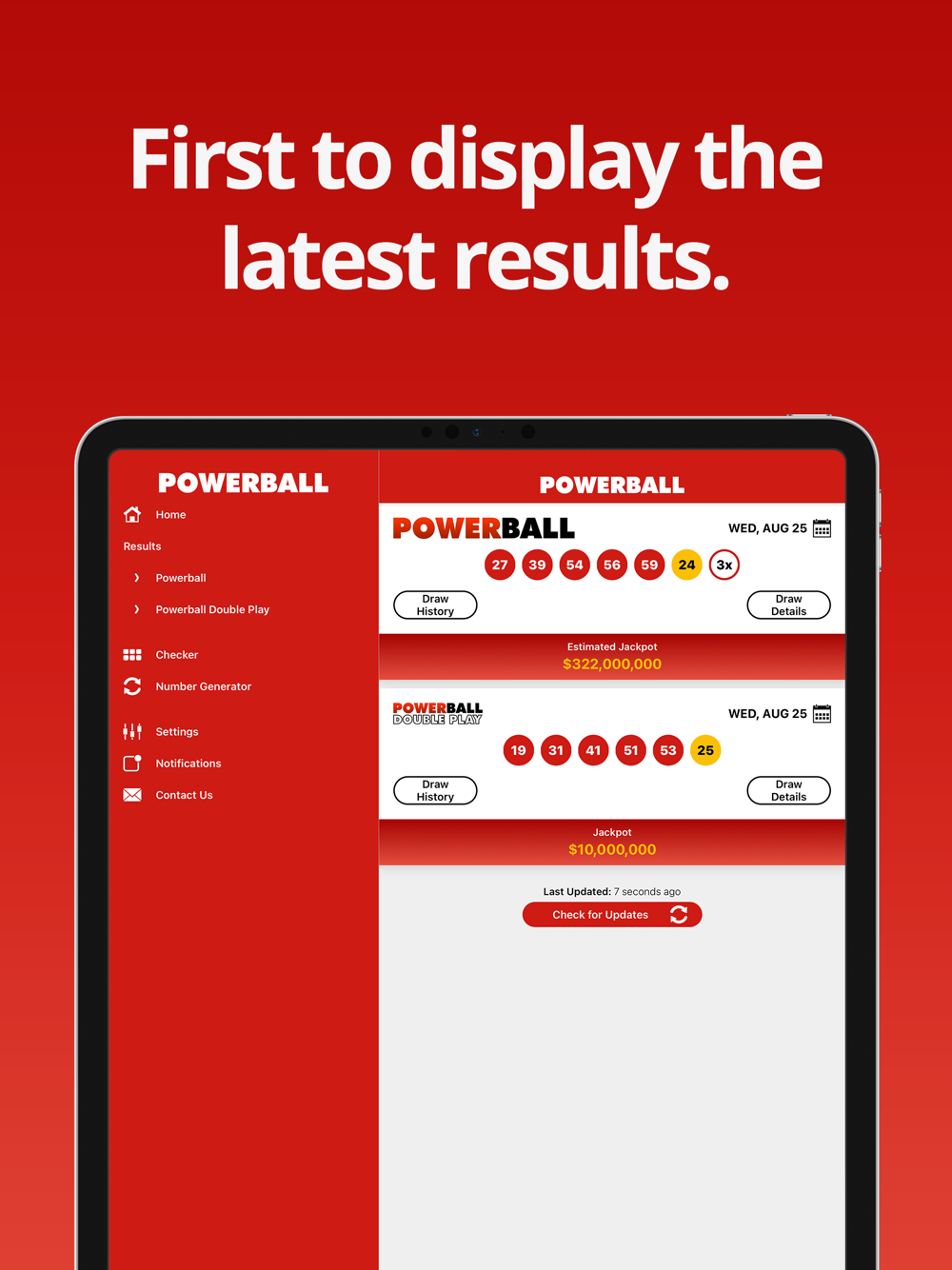 Get the latest Powerball results within moments of the draw taking place. This easy-to-use app shows the Powerball numbers (including Power Play and Double Play) and full prize breakdown including number of winners and prizes paid.