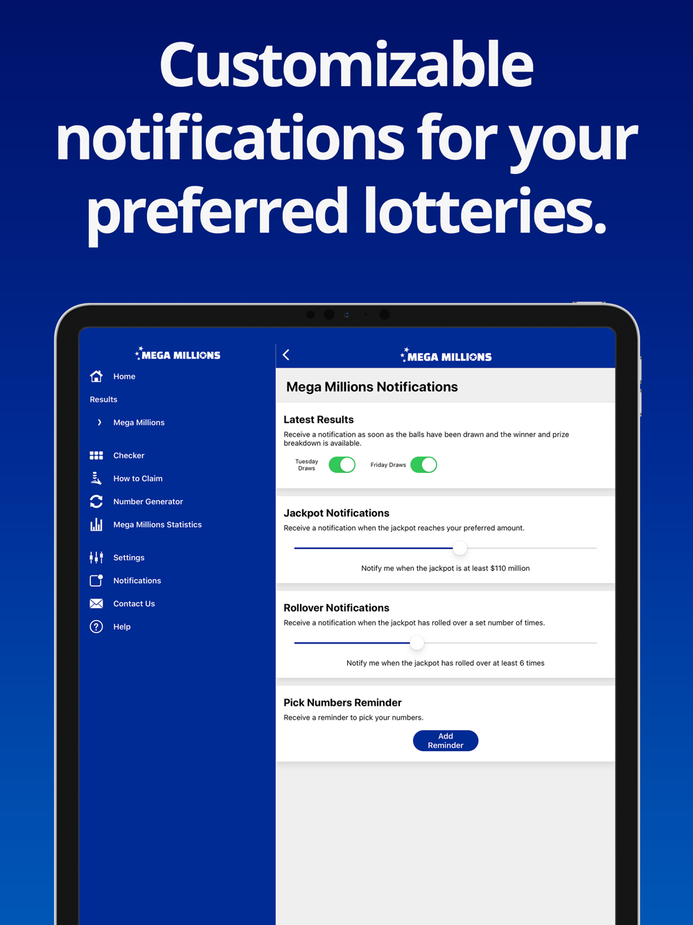 Get notified instantly when the latest lottery results and prize breakdowns become available. The App allows you to customise notifications for specific lottery games and you can also choose which days of the week you play. Want to know when the jackpot has rolled over or has reached a certain amount? Just head to the Notification section of the app to set up your alerts. There is also the option to set notifications at times that suit you - great for reminding you to purchase tickets before the draw.