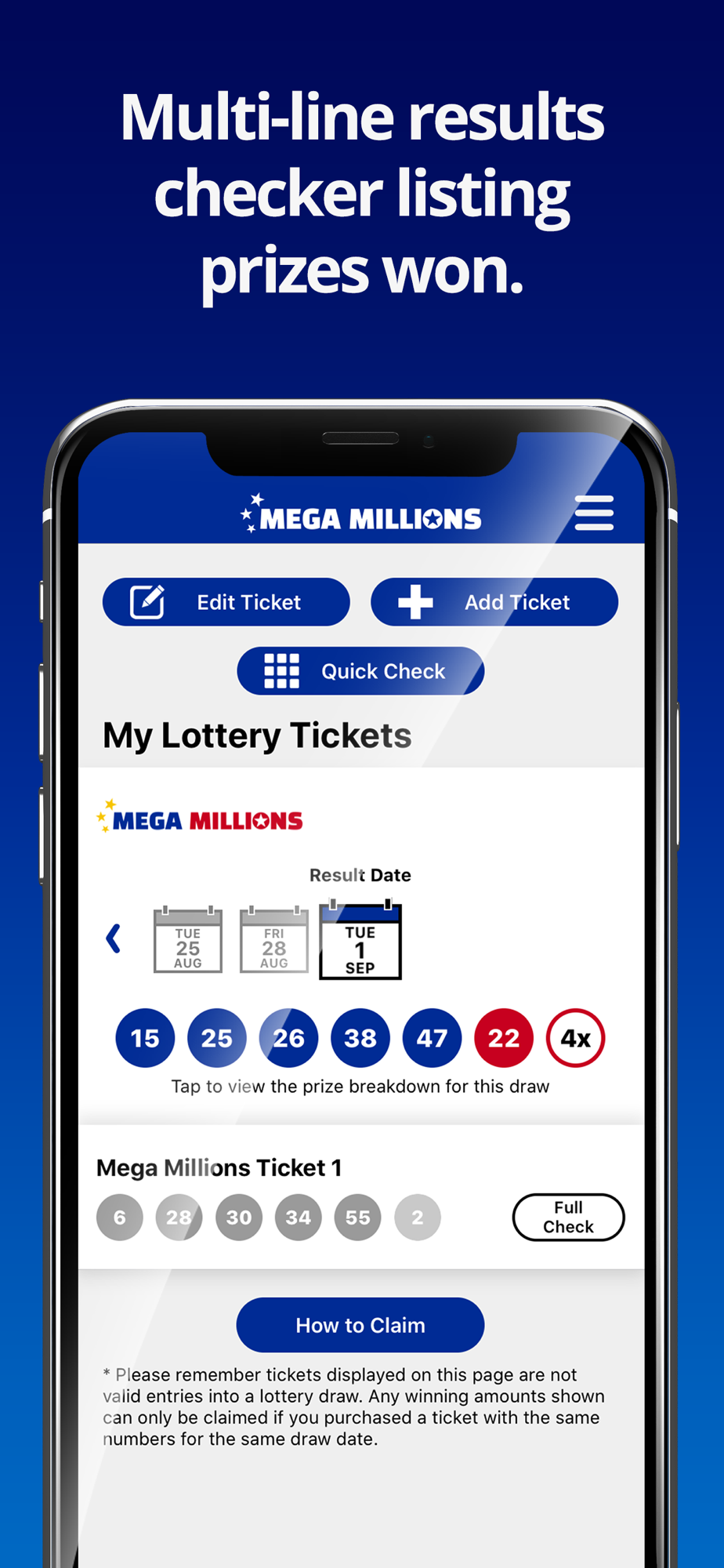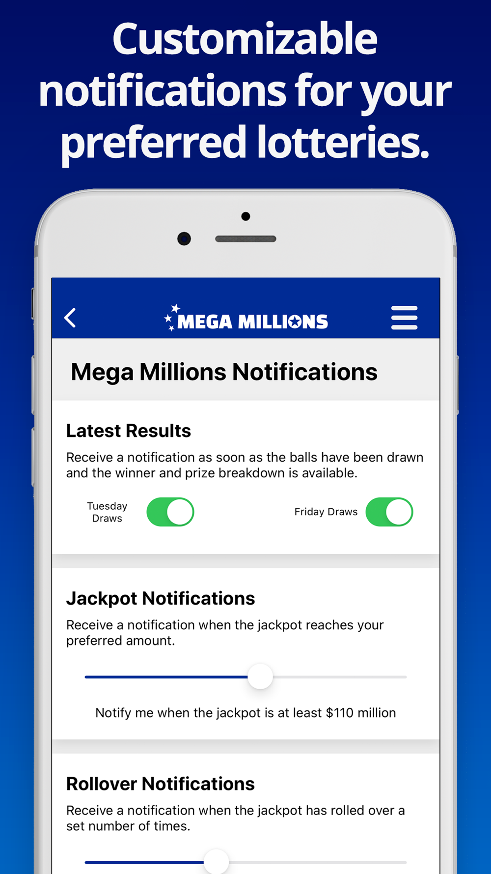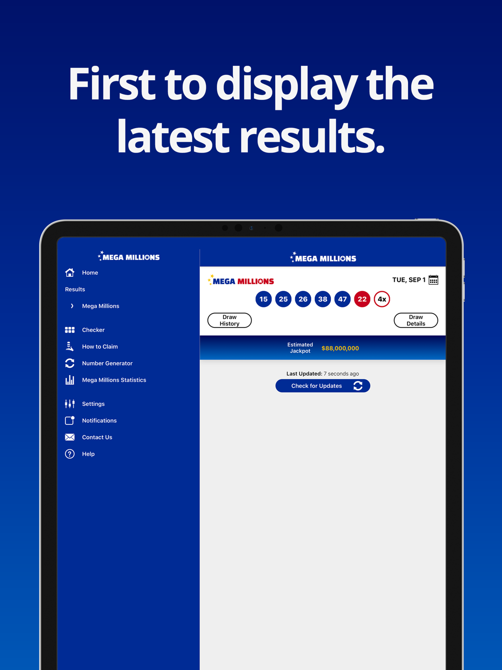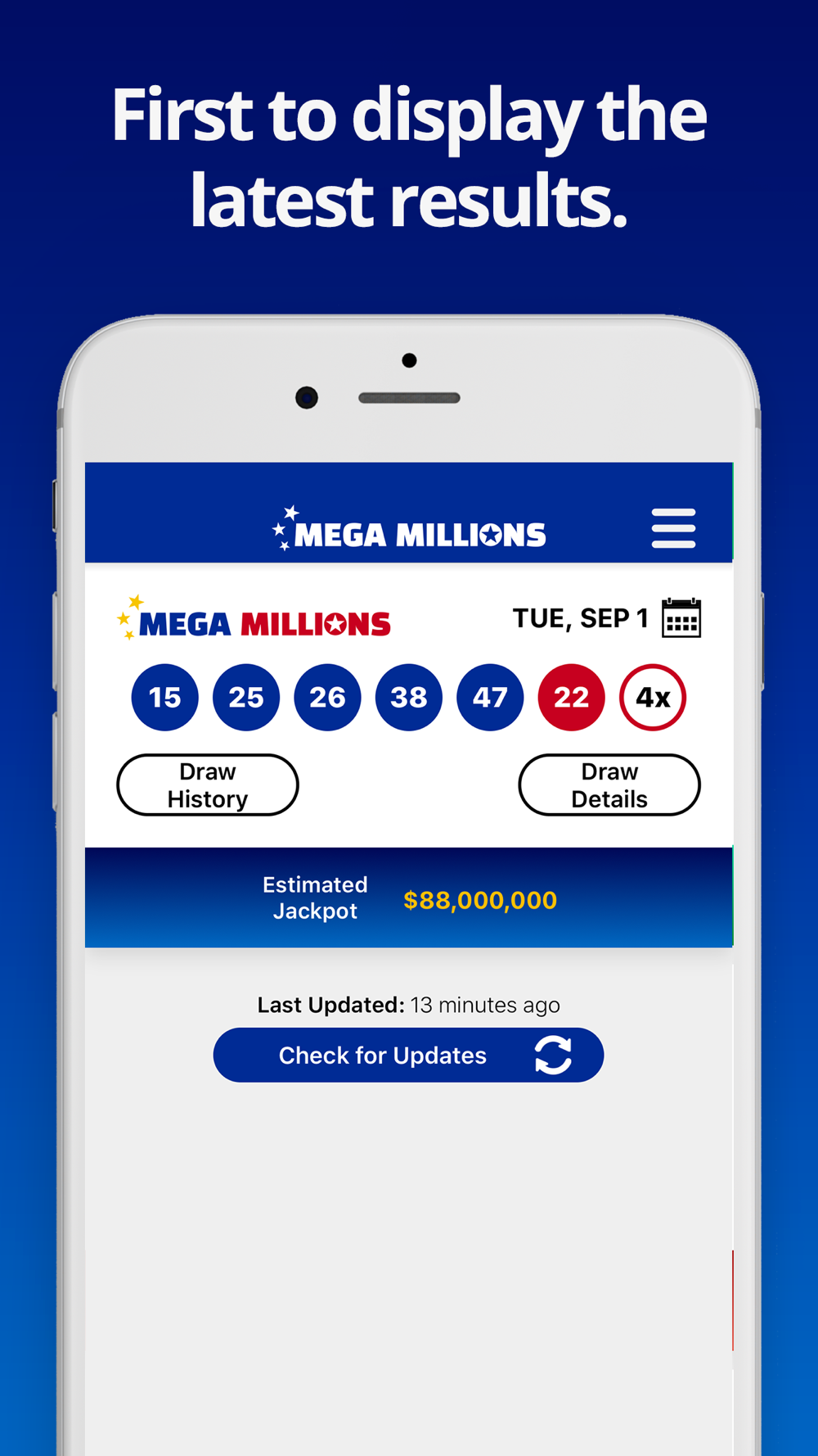 Get the latest Mega Millions results within moments of the draw taking place. This easy to use app shows the Mega Millions numbers (including Megaplier) and full prize breakdown including number of winners and prizes paid.
