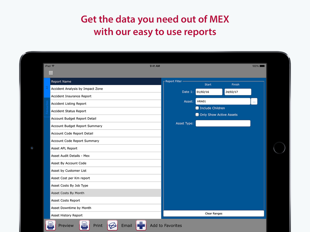 • Reports – Generate reports on the spot to help you make maintenance decisions wherever you are.