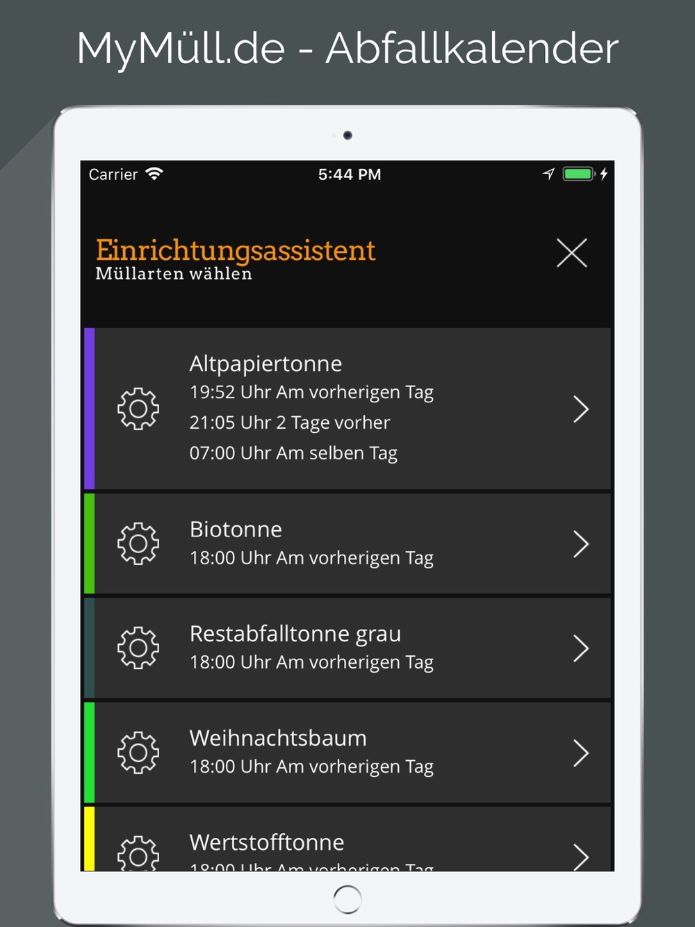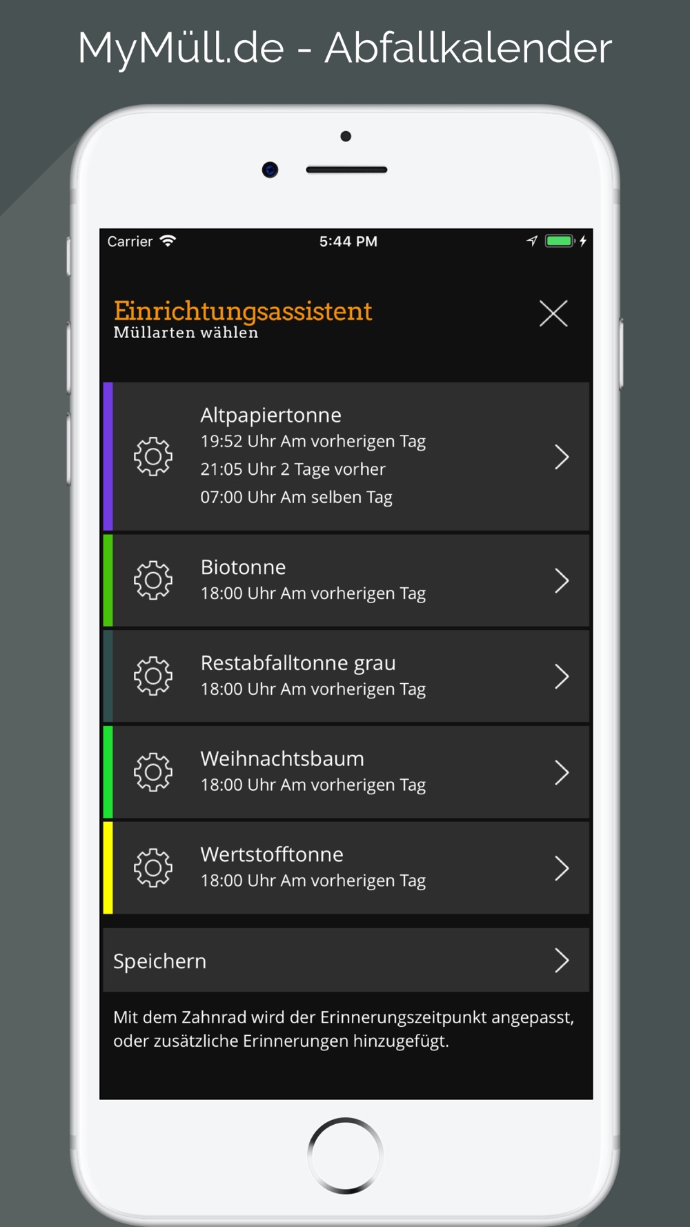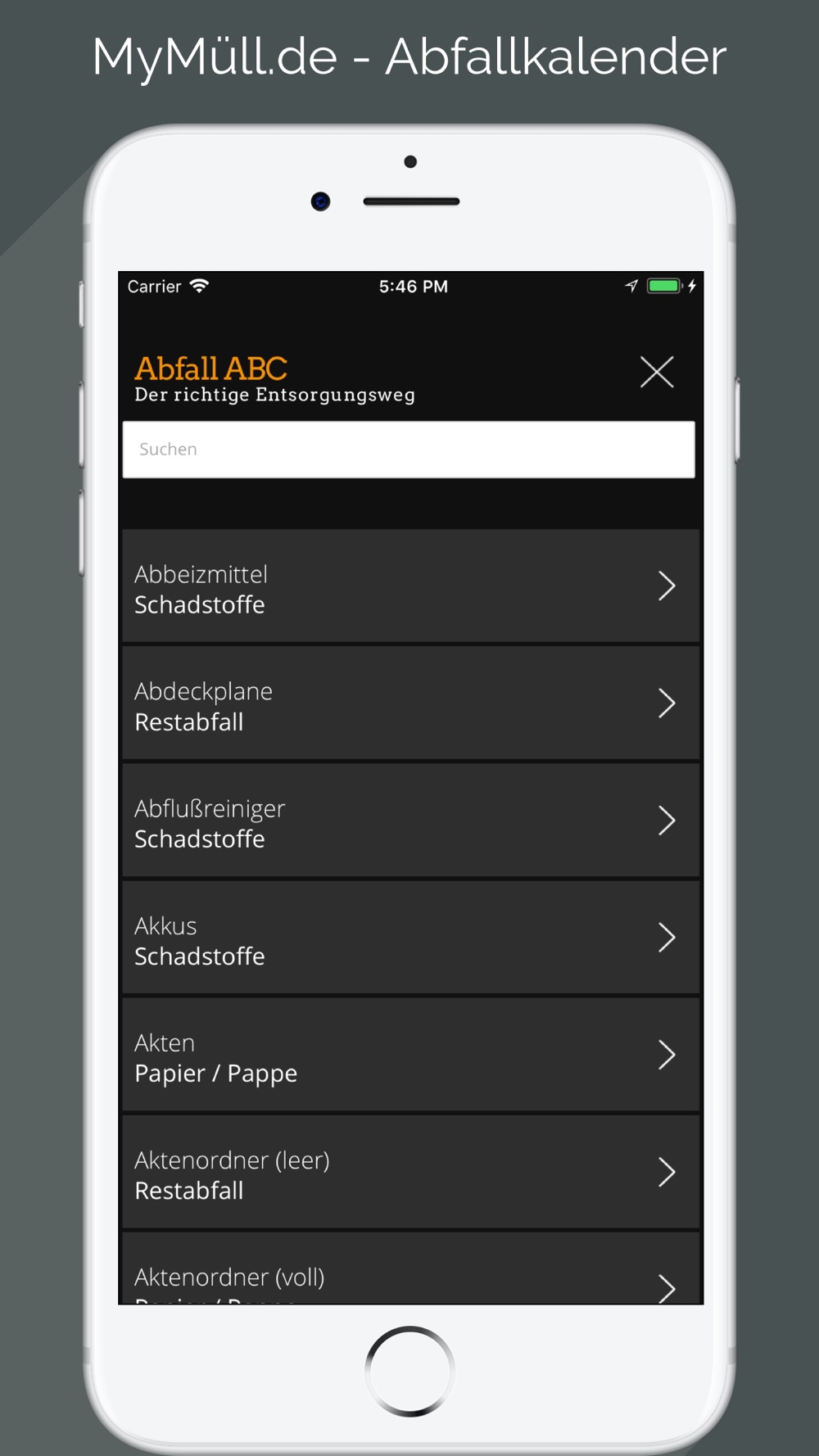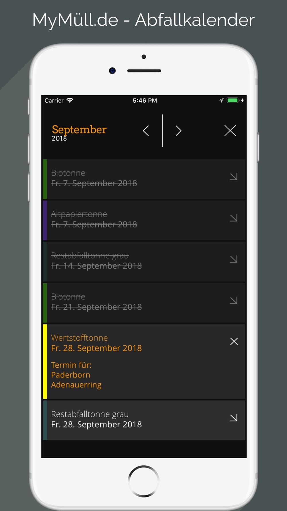 MyMüll.de erinnert zuverlässig an jeden Entsorgungstermin. Die kostenlose App ist im Handumdrehen eingerichtet: Straße eingeben, Müll- oder Wertstoffsorte wählen, Erinnerungszeitpunkt festlegen. Fertig.