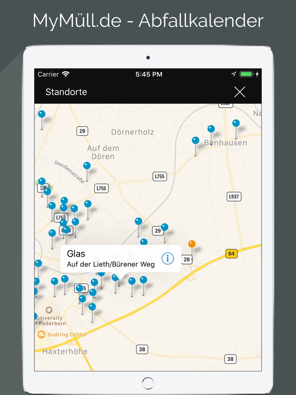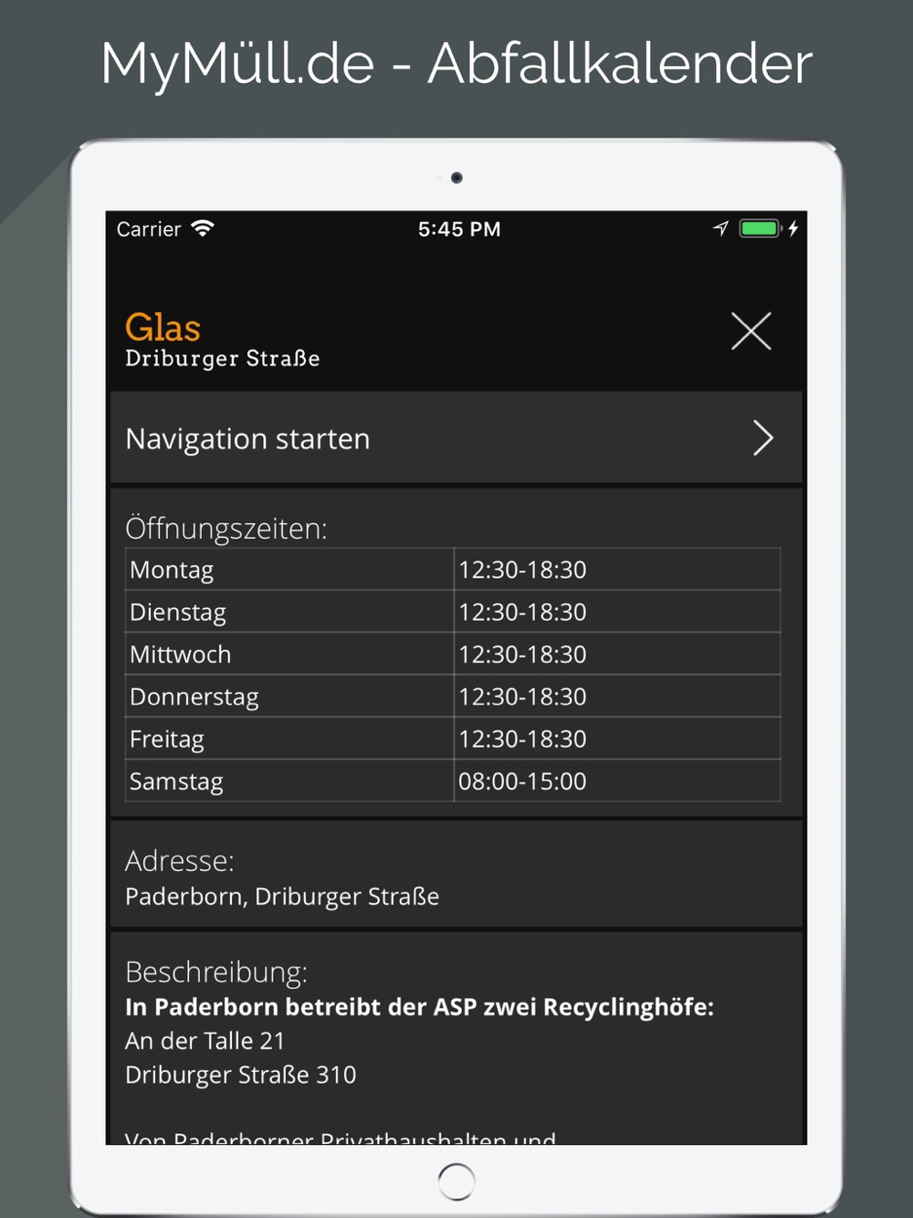 MyMüll.de navigiert auch zuverlässig zum nächsten Wertstoffcontainer oder Recyclinghof und kennt die Öffnungszeiten.